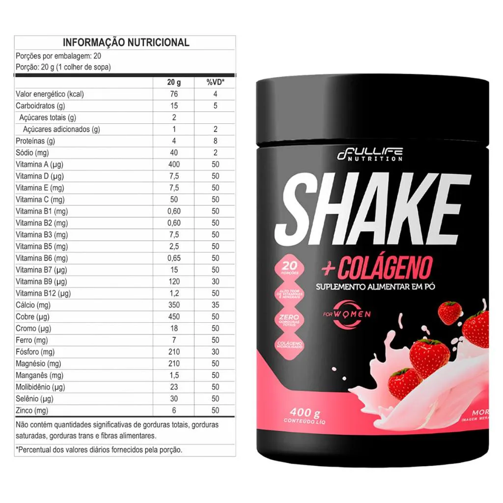 - O SHAKE SUBSTITUTO DE REFEIÇÃO FULLIFE é SEM GLUTEN e com COLAGENO com uma fórmula completa e exclusiva, shake for women foi desenvolvido com qualidade nutricional, sua fórmula contém colágeno hidrolisado que atua como uma auxiliar para fortalecimento da pele para quem esta em processo de emagrecimento, contém em sua composição vitaminas e minerais que essenciais.
