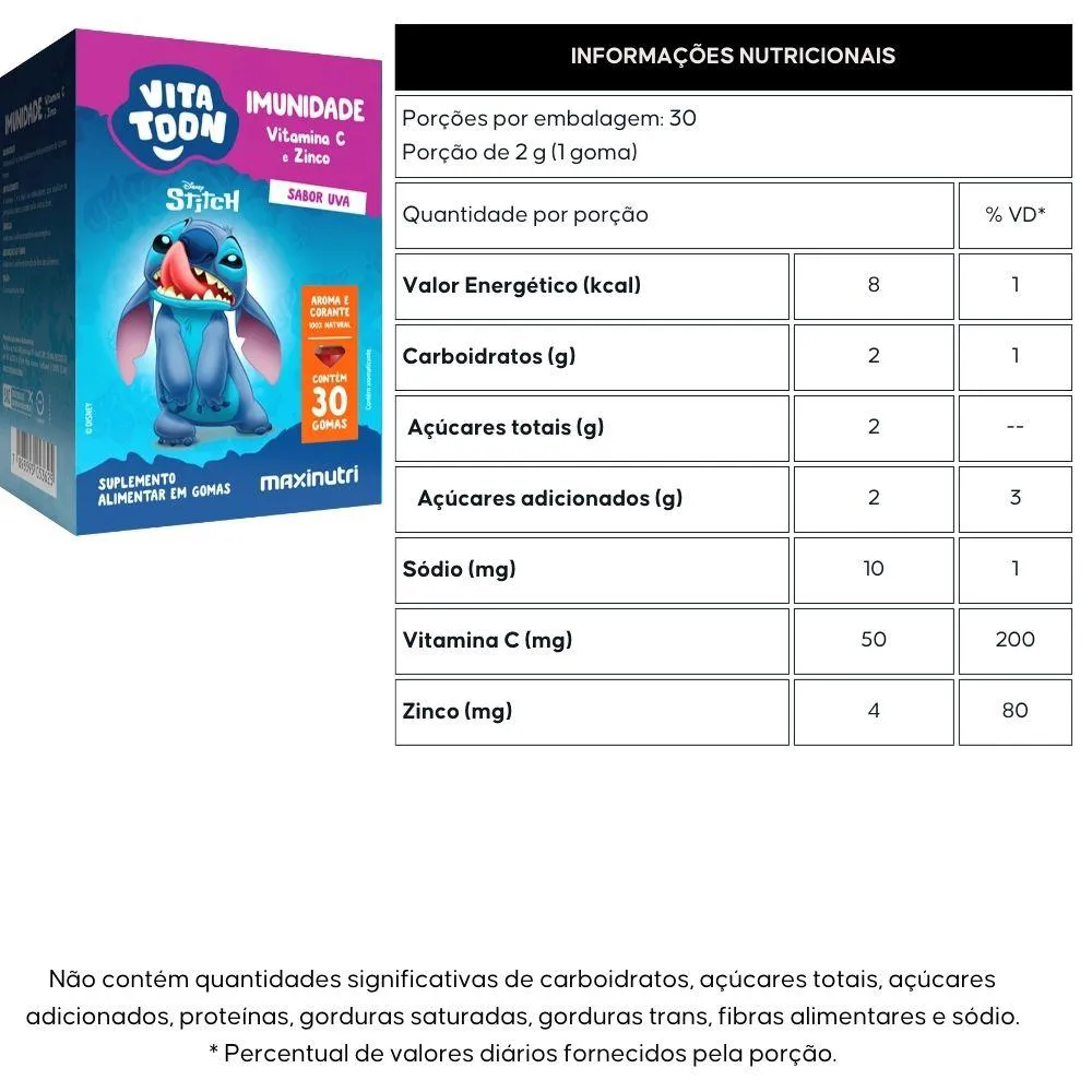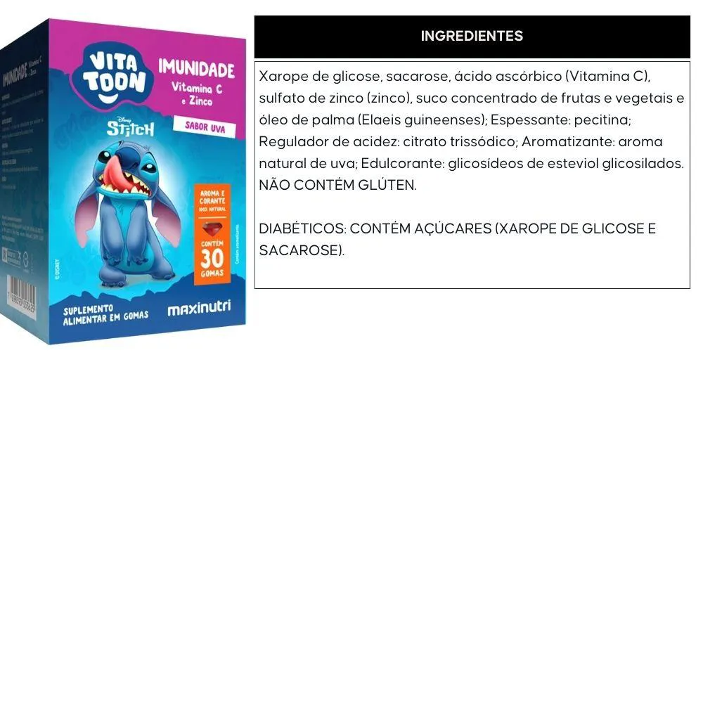 KIT com 3 unidades de vitamina C com Zinco Kids Vitatton Stitch da marca Maxinutri com 30 gomas cada.