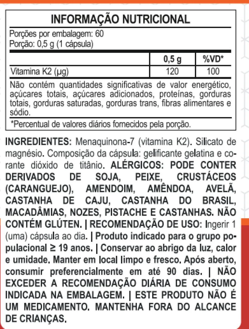 INGREDIENTES: Menaquinona-7 (vitamina K2). Silicato de magnésio. Composição da cápsula: gelificante gelatina e co-rante dióxido de titânio.