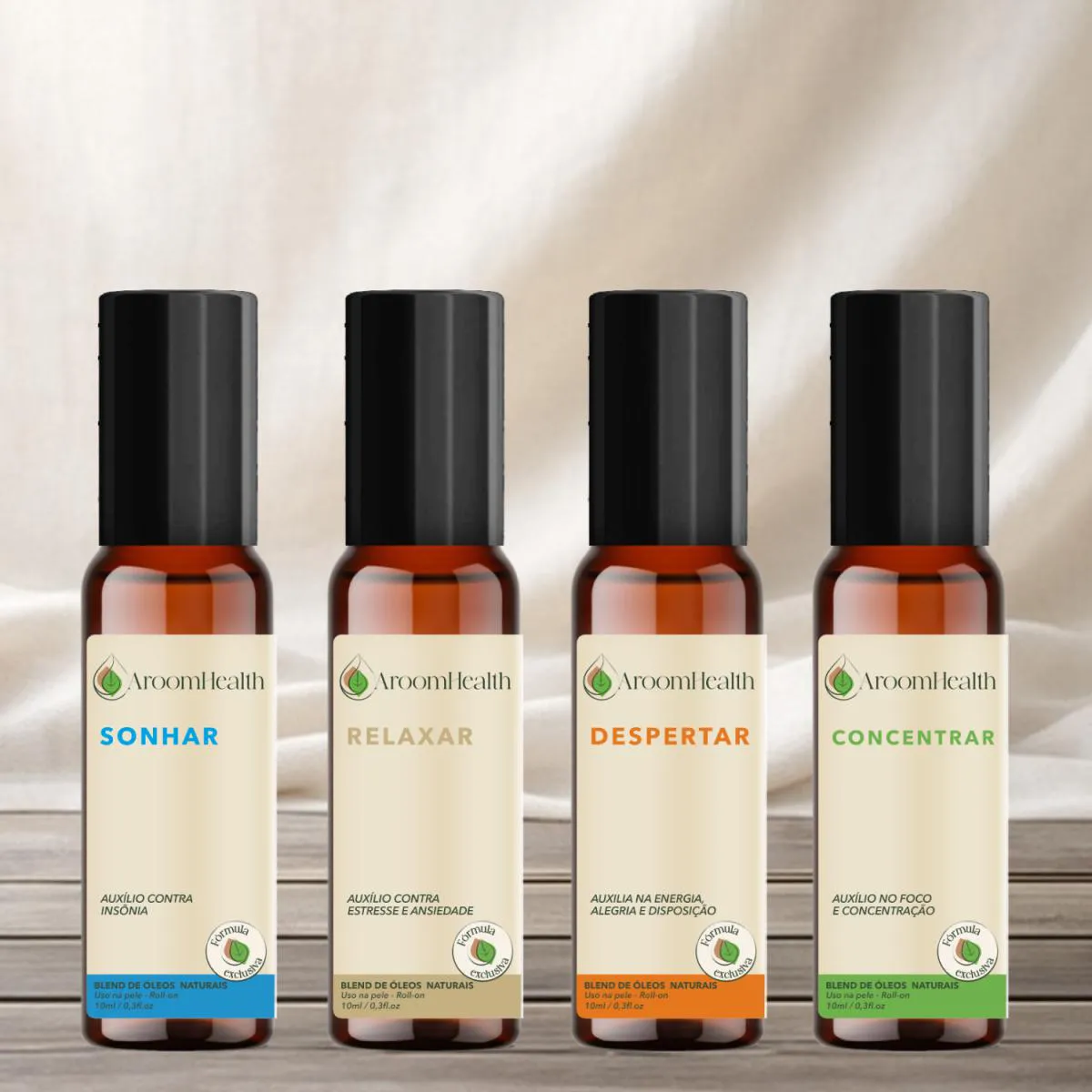 O kit é uma coleção de quatro blends de óleos essenciais puros e naturais, cada um com 10 ml, desenvolvidos para diferentes momentos e necessidades do dia. Cada blend é formulado com óleos essenciais específicos e óleo vegetal de semente de uva, acondicionado em frasco roll-on âmbar com esfera aplicadora.
