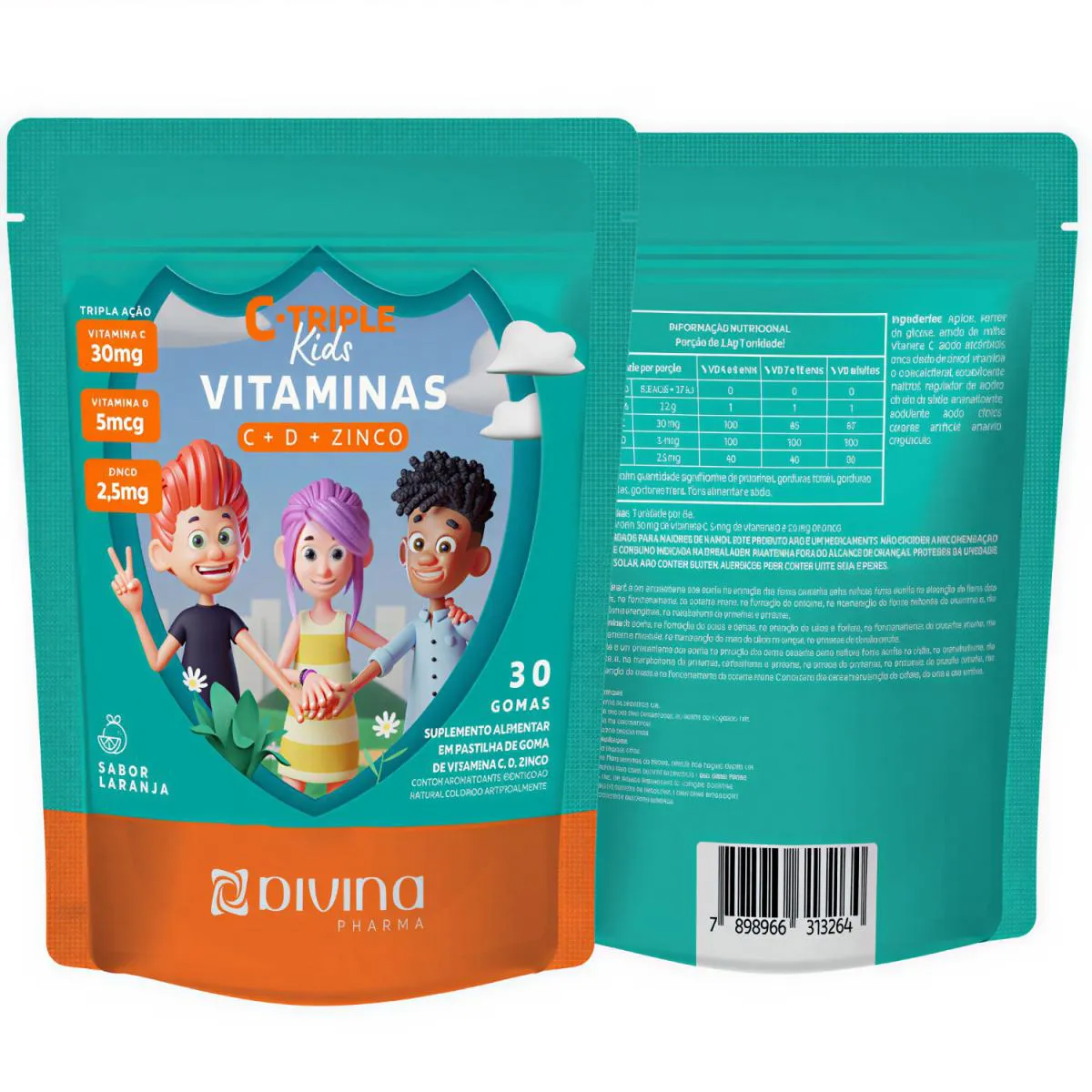 COMBO COM 4 C-TRIPLE KIDS VITAMINAS C + D + ZINCO COM 30 GOMAS CADA - TOTAL: 120 GOMAS – DIVINA PHARMA _x000D_ _x000D_ - descrição – INDÚSTRIA DO corpo _x000D_ C-Triple Kids vitamina C Sabor Laranja 30 Gomas Mastigáveis - C-Triple é um suplemento de vitamina c enriquecido com Zinco e vitamina d, visando uma tripla ação no reforço da imunidade. _x000D_ A vitamina C, o Zinco e a Vitamina D auxiliam no funcionamento do sistema imune, além disso o Zinco também é um antioxidante que auxilia na proteção dos danos causados pelos radicais livres. _x000D_ A vitamina C é um antioxidante que auxilia na proteção dos danos causados pelos radicais livres. Auxilia na absorção de ferro dos alimentos, no funcionamento do sistema imune, na formação do colágeno, na regeneração da forma reduzida da vitamina e, no metabolismo energético, no metabolismo de proteínas e gorduras. _x000D_ A vitamina D auxilia na formação de ossos e dentes, na absorção de cálcio e fósforo, no funcionamento muscular, na manutenção de níveis de cálcio no sangue, no processo de divisão celular. _x000D_ O zinco é um antioxidante que auxilia na proteção dos danos causados pelos radicais livres, auxilia na visão, no metabolismo da vitamina A, no metabolismo de proteínas, carboidratos e gorduras, na síntese de proteínas, carboidratos e gorduras, na síntese de proteínas, no processo de divisão celular, na manutenção de ossos e no funcionamento do sistema imune. O zinco contribuí para a manutenção do cabelo, da pele e das unhas. _x000D_ _x000D_ - benefícios – INDÚSTRIA DO CORPO _x000D_ - Sistema imune; _x000D_ - Fortalecimento dos ossos e dentes; _x000D_ - Auxilia na formação do colágeno; _x000D_ - Antioxidante, combate os danos causados pelos radicais livres; _x000D_ - Auxilia na visão; _x000D_ - Saúde dos cabelos, pele e unhas; _x000D_ - Gomas mastigáveis. _x000D_ _x000D_ - sugestão de uso – INDÚSTRIA DO CORPO _x000D_ 1 (uma) unidade por dia. _x000D_ _x000D_ - tabela nutricional – _x000D_ EM ANEXO NAS IMAGENS _x000D_ _x000D_ - composição – _x000D_ EM ANEXO NAS IMAGENS _x000D_ _x000D_ - recomendações – _x000D_ EM ANEXO NAS IMAGENS _x000D_ _x000D_ - dados técnicos – INDÚSTRIA DO CORPO _x000D_ Marca – Divina Pharma.