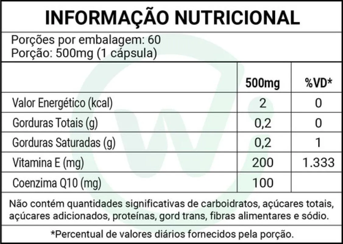 Ingrediente ativo: Coenzima Q10 (100 mg por cápsula no formato lipossomal, nas formas ubiquinona e ubiquinol) Co‑ativo: vitamina e (D‑alfa-tocoferol – 200 mg) Veículo: Triglicerídeos de cadeia média (TCM) Cápsula: Gelatina animal, glicerina e água purificada Alergênicos: Não contém glúten. Livre de corantes artificiais. Pode conter traços de derivados de soja (TCM).Recomendação de Uso