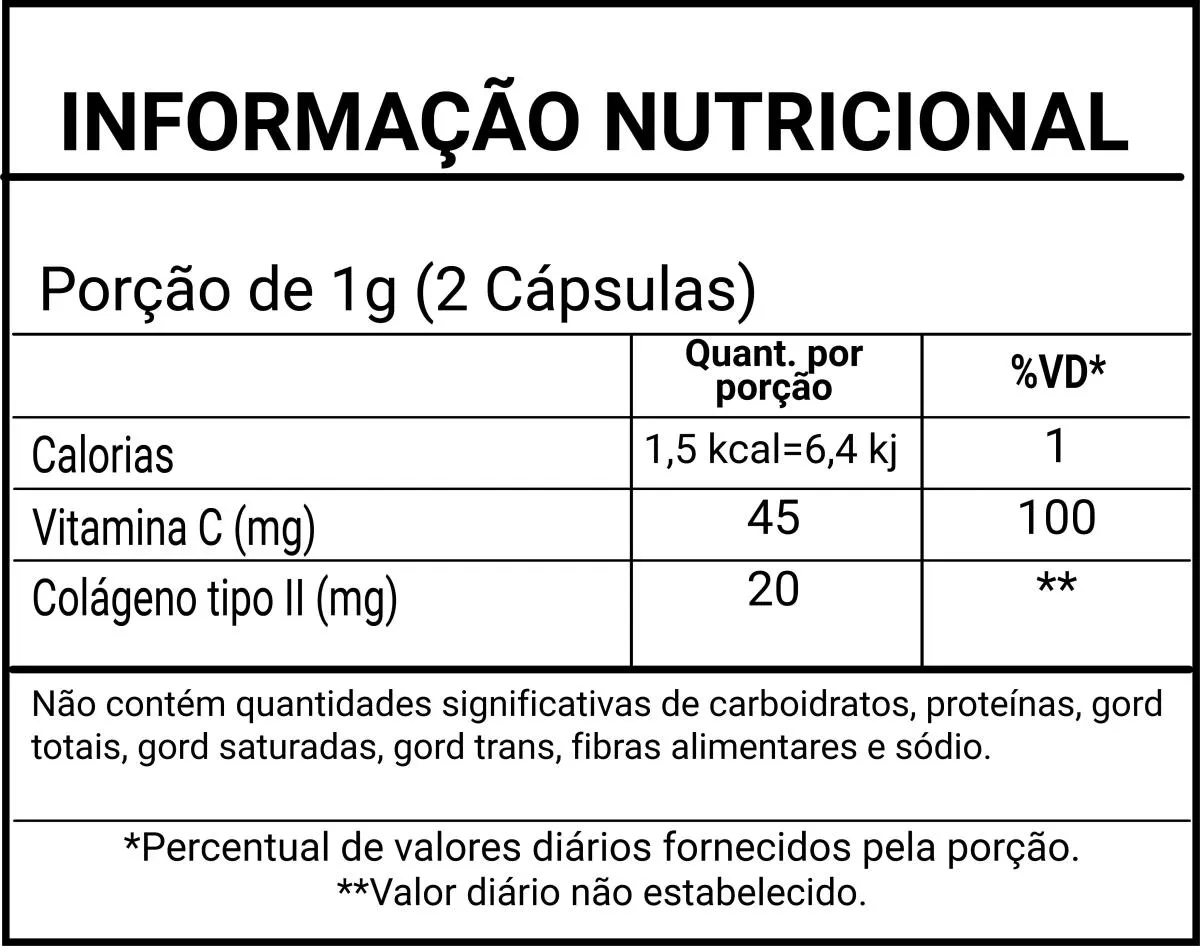 O Colágeno Tipo 1, 2 e 3 com vitamina C da Qualylife é um suplemento alimentar desenvolvido para promover a saúde da pele, ossos, cartilagens e tecidos conjuntivos. Combina três tipos de colágeno com vitamina C, essencial para a síntese de colágeno no organismo. Composição: Colágeno hidrolisado, Vitamina C (ascorbato de cálcio), Colágeno tipo II, Silicato de magnésio, Antiumectante: dióxido de silício, Celulose microcristalina; Composição da cápsula: gelatina, umectante glicerina e corante dióxido de titânioNÃO CONTÉM GLÚTEN Recomendação de Uso: Ingerir 2 cápsulas ao dia. Advertências: