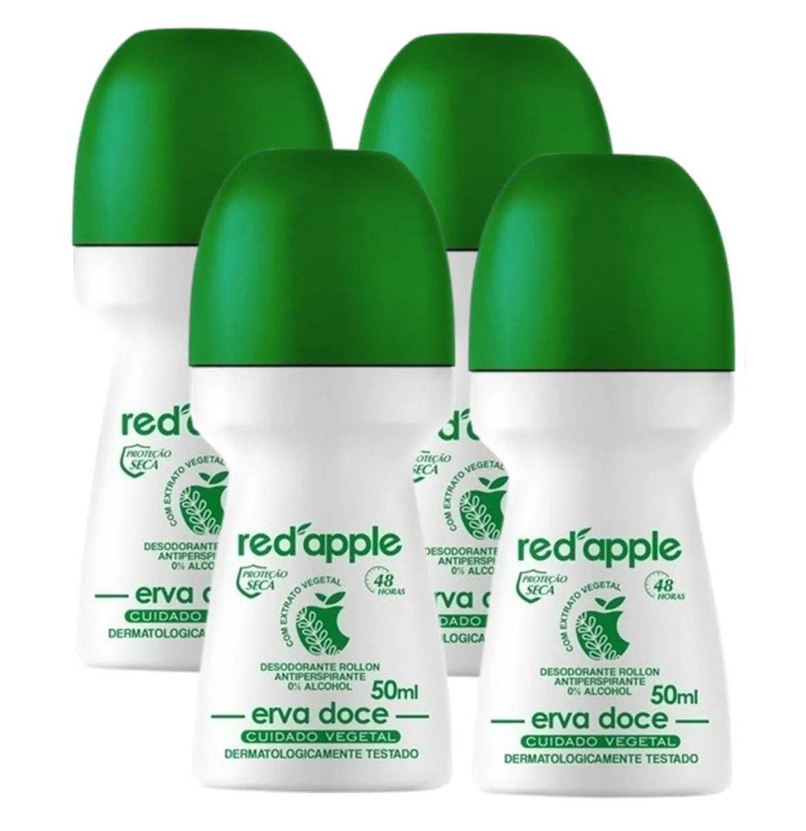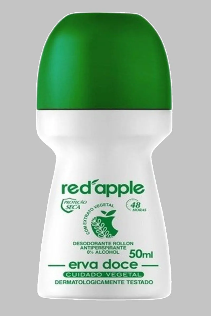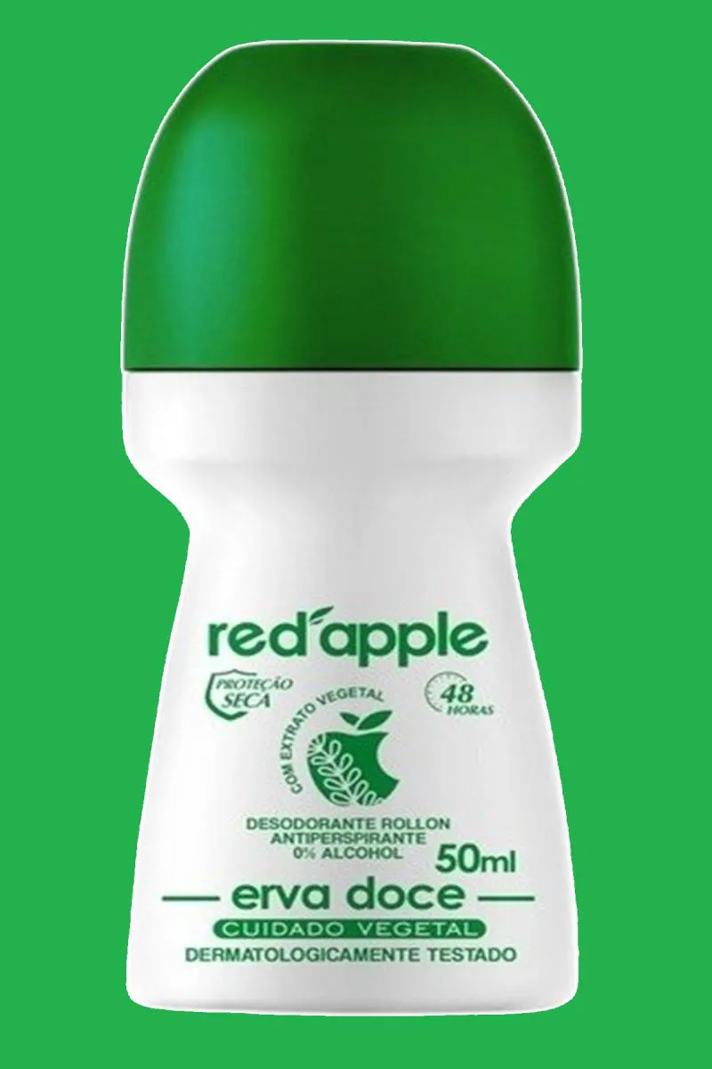 O produto é um kit composto por 4 desodorantes roll-on da marca Red Apple, com fragrância de Erva Doce. Trata-se de um desodorante e antitranspirante desenvolvido para oferecer proteção contra sudorese e odores corporais, com duração de 48 horas de proteção. Possui fórmula seca, sem álcool e sem corantes, sendo dermatologicamente testado.