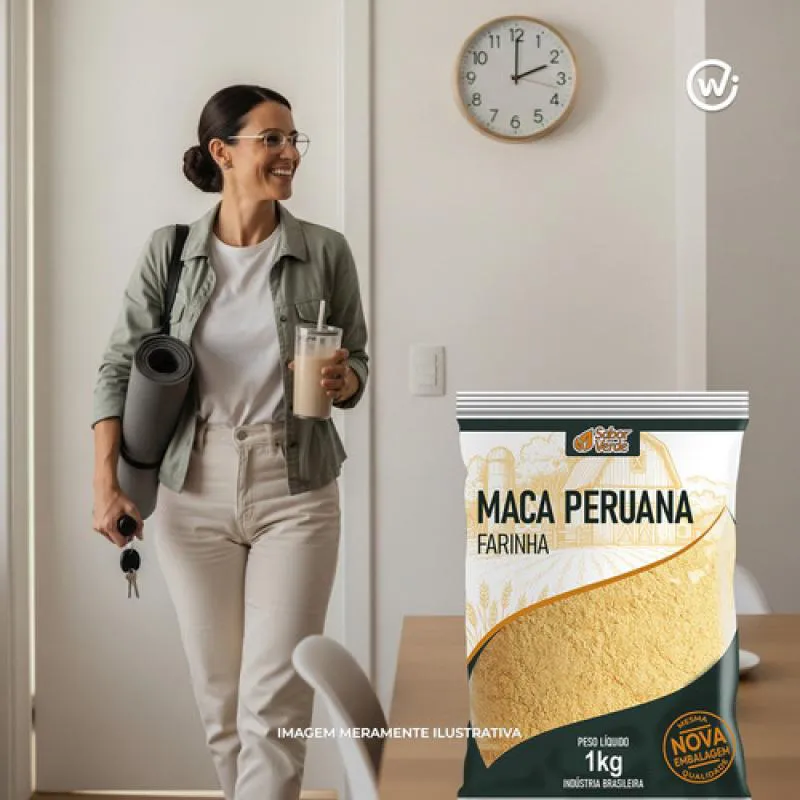 A Farinha de Maca Peruana da linha Sabor Verde é apresentada em embalagem de 1 kg, produzida a partir da raiz de Lepidium meyenii, cuidadosamente moída para preservar seus nutrientes essenciais.
