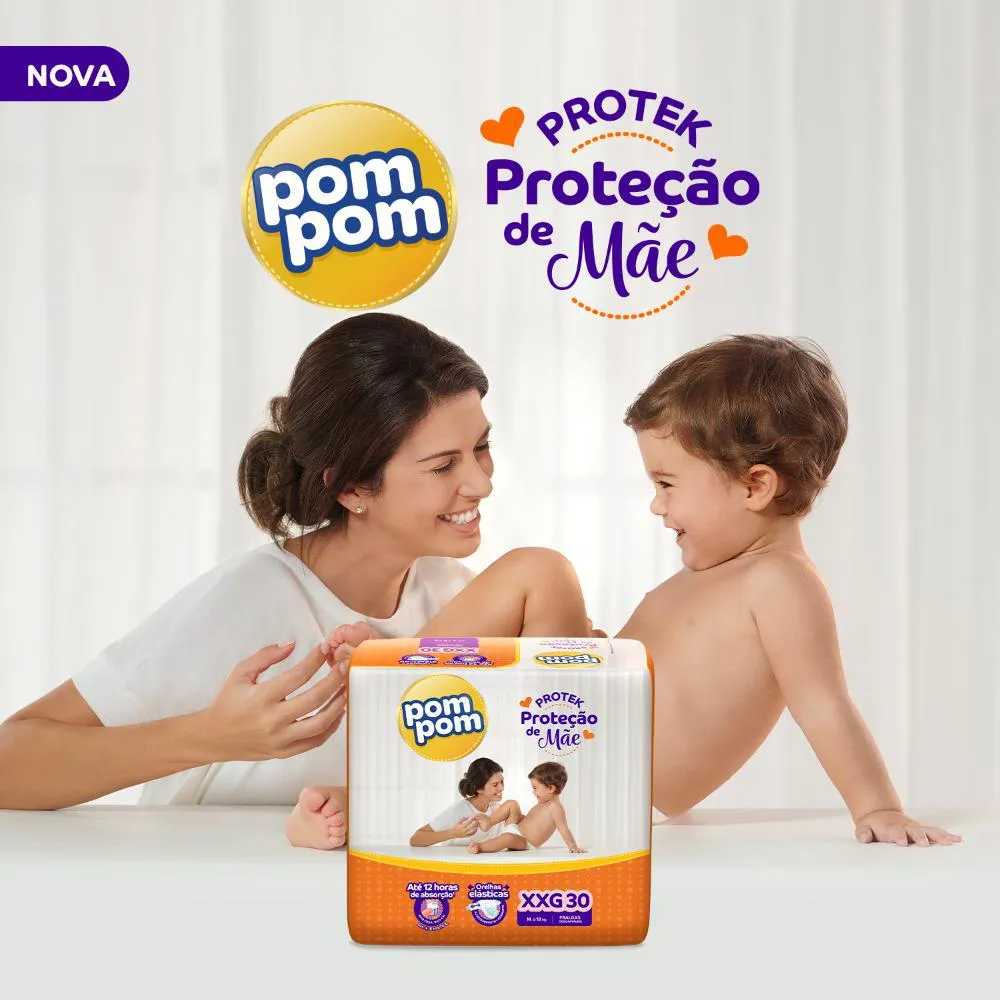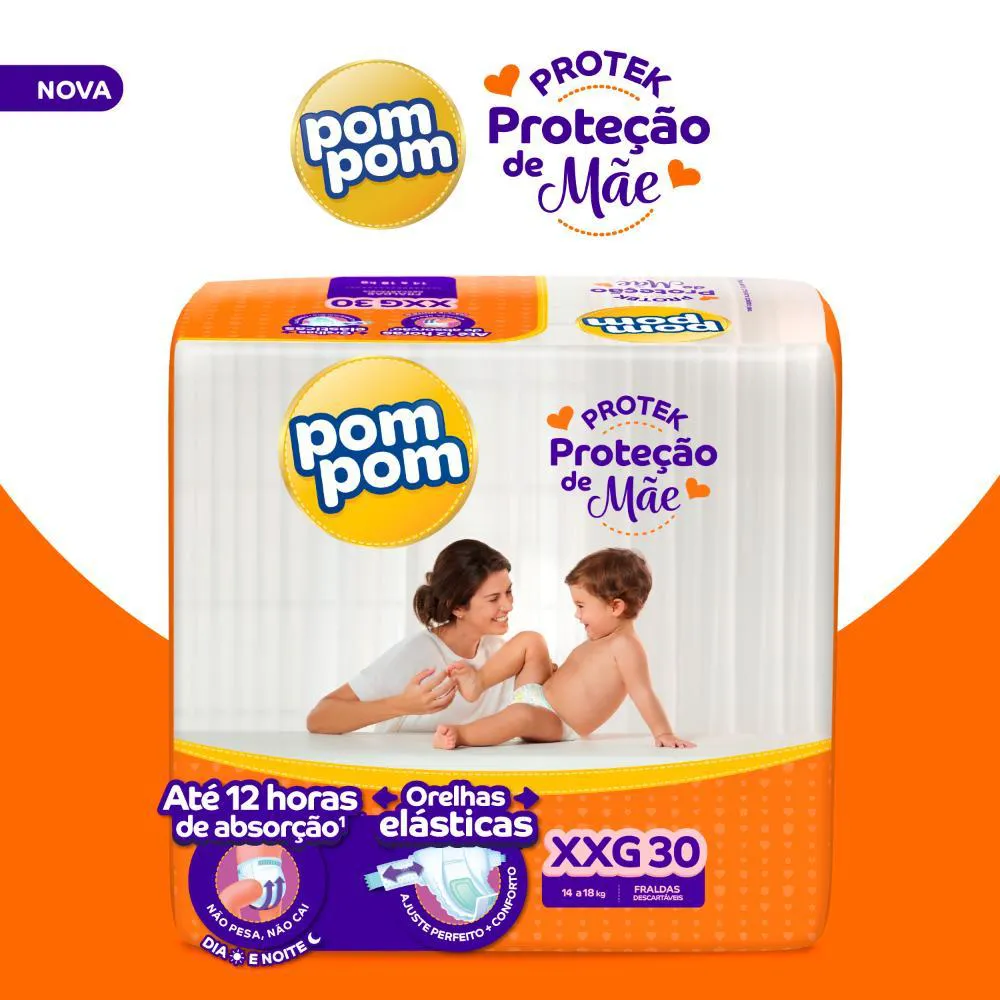 O Kit contém: 4 pacotes de Fraldas Pom Pom Derma Protek Mega XXG com 30un cada.