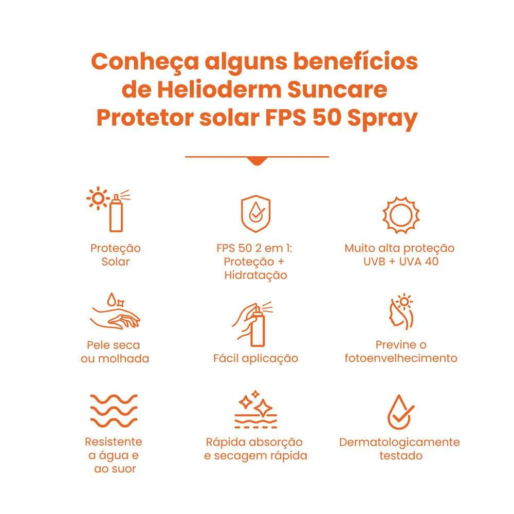 Kit 4 protetor solar Spray Corporal FPS 50 200ml –Kley Hertz Protetor corporal em spray com alta proteção (FPS50) contra os raios UVA e UVB, ação multifuncional 2 em 1 (proteção + hidratação), resistente à água e ao suor. Possui tecnologia duo protection que facilita a aplicação na pele seca ou molhada. Dermatologicamente testado. Linha Helioderm Helioderm é uma linha completa de Proteção Solar desenvolvida com fórmulas dermocosméticas e tecnologia farmacêutica que protegem e hidratam a pele de toda a família. Proporciona alta proteção UVA + UVB, prevenindo o fotoenvelhecimento e protegendo contra os efeitos nocivos causados pela exposição à radiação ultravioleta. Helioderm é ideal para o uso diário através de produtos com texturas leves, de rápida absorção, resistentes à água e ao suor e aprovado por dermatologistas e pediatras. MODO DE USO: indicada para proteção e cuidado diários da pele, sua aplicação é indicada no mínimo 30 minutos antes da exposição ao sol, deve ser reaplicado a cada duas horas ou após suor intenso e/ou contato com a água. Não aplicar o produto diretamente no rosto, colocar primeiro nas mãos e depois espalhar na face, evitando a região do contorno dos olhos. CUIDADOS DE CONSERVAÇÃO: Conservar o produto em local seco e fresco, quando não estiver utilizando. ADVERTÊNCIAS E RESTRIÇÕES DE USO: