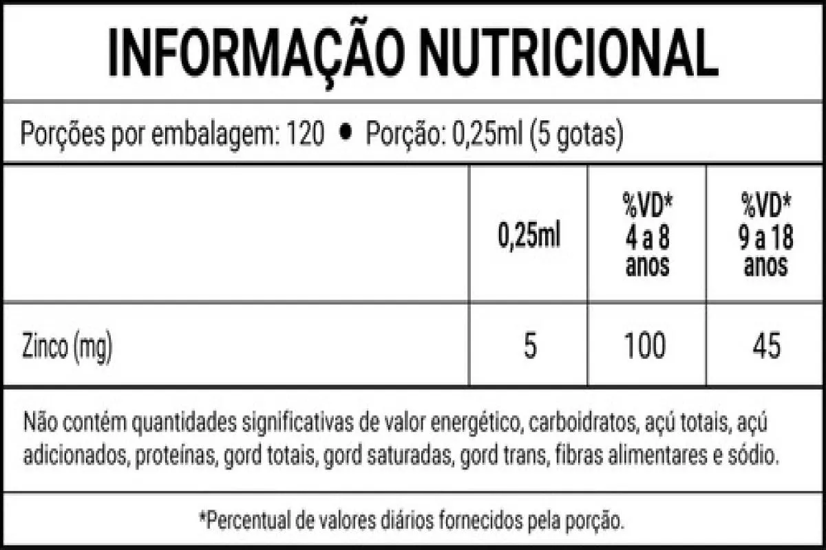 Quantidade de porções por embalagem: 120 Zinco: 5 mg – representa 100% do Valor Diário para crianças entre 4–8 anos Valor energético: 3 kcal (devido aos excipientes)