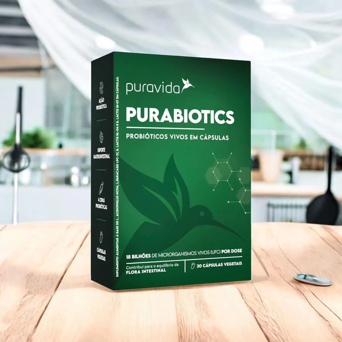 Purabiotics da Puravida é um suplemento alimentar premium formulado para promover o equilíbrio da microbiota intestinal e fortalecer as defesas naturais do organismo. Cada dose contém 18 bilhões de microrganismos vivos, provenientes de quatro espécies probióticas cuidadosamente selecionadas, encapsulados em cápsulas vegetais gastrorresistentes que garantem a chegada dos probióticos vivos ao intestino, onde exercem sua função pró-saúde. Composição: Lactobacillus acidophilus NCFM (ATCC SD5221), Lactobacillus paracasei Lpc-37 (ATCC SD5275), Bifidobacterium animalis subsp. lactis Bl-04 (ATCC SD5219), Bifidobacterium animalis subsp. lactis Bi-07 (ATCC SD5220), Agente de massa: celulose microcristalina, Antiumectantes: estearato de magnésio e dióxido de silício.Cápsula: espessante hidroxipropilmetilcelulose.