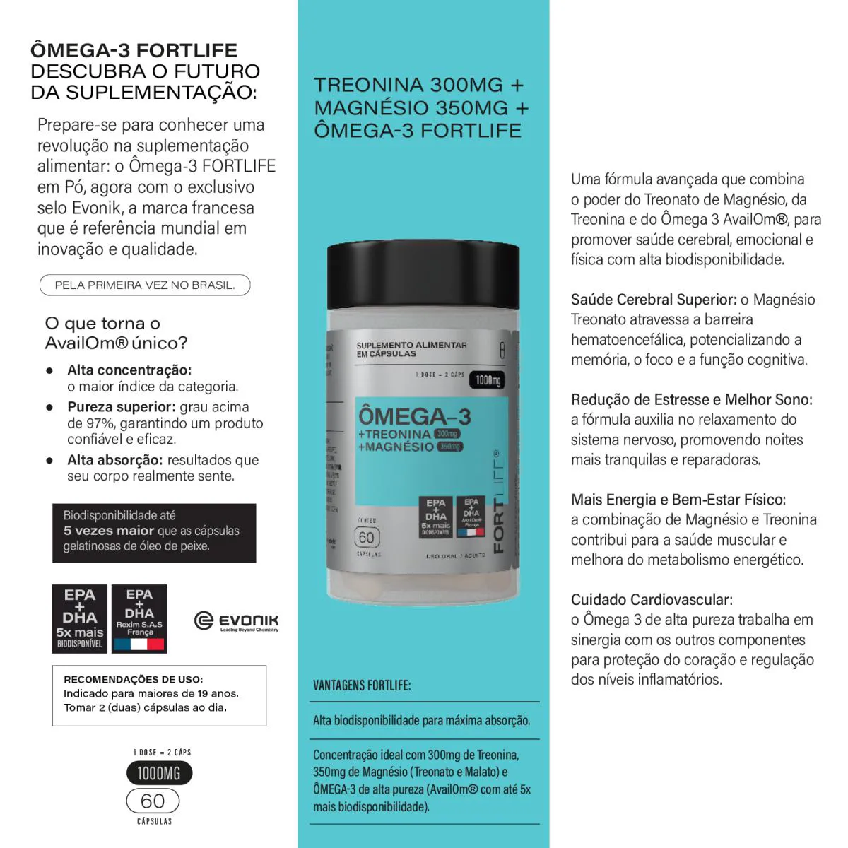 O produto é um suplemento alimentar em cápsulas que combina Ômega-3, Treonina e Magnésio, desenvolvido pela marca FortLife com tecnologia AvailOm®. Trata-se de um suplemento com alta concentração, pureza superior e biodisponibilidade elevada.