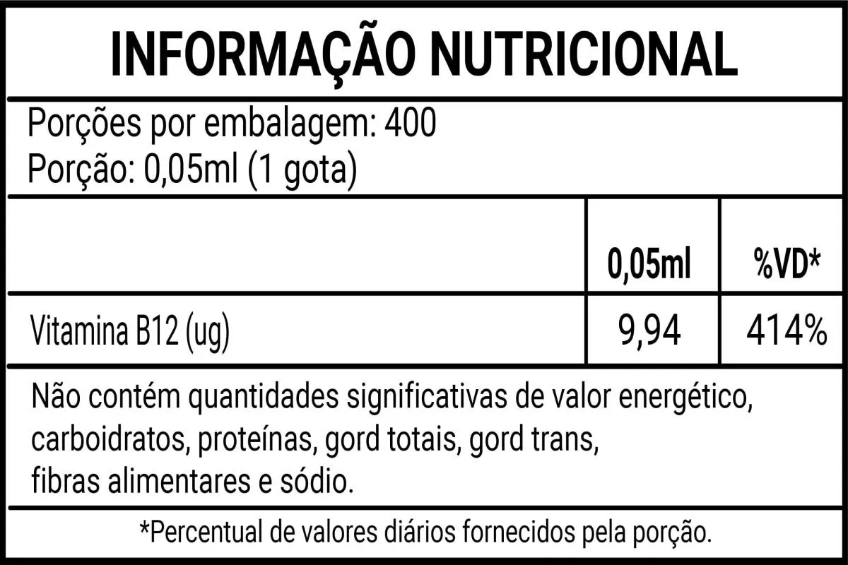 - Suplementação prática de vitamina B12 em formato líquido.