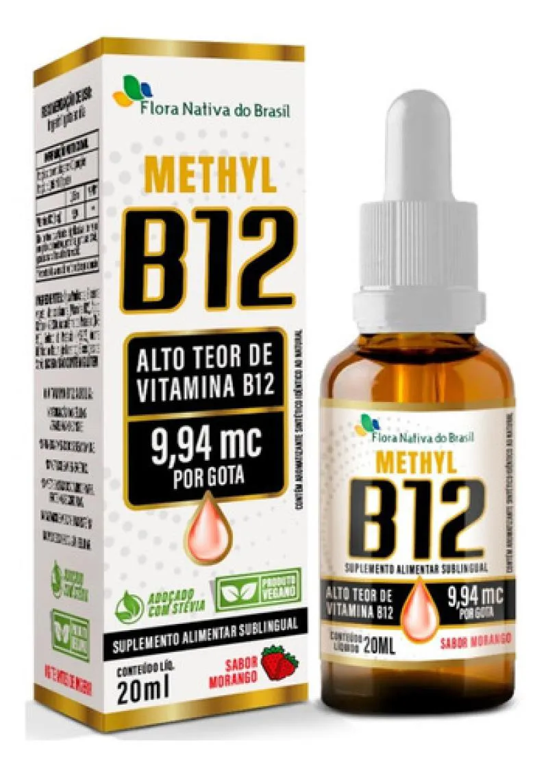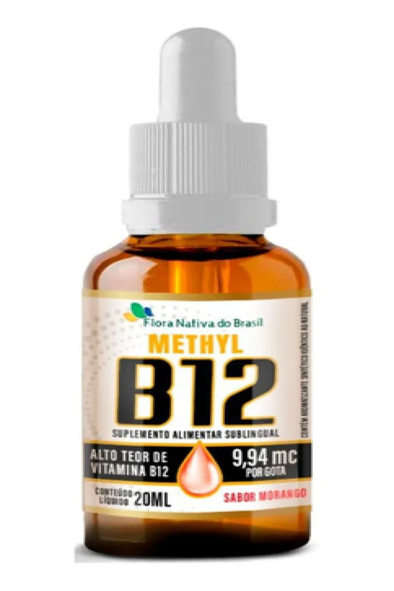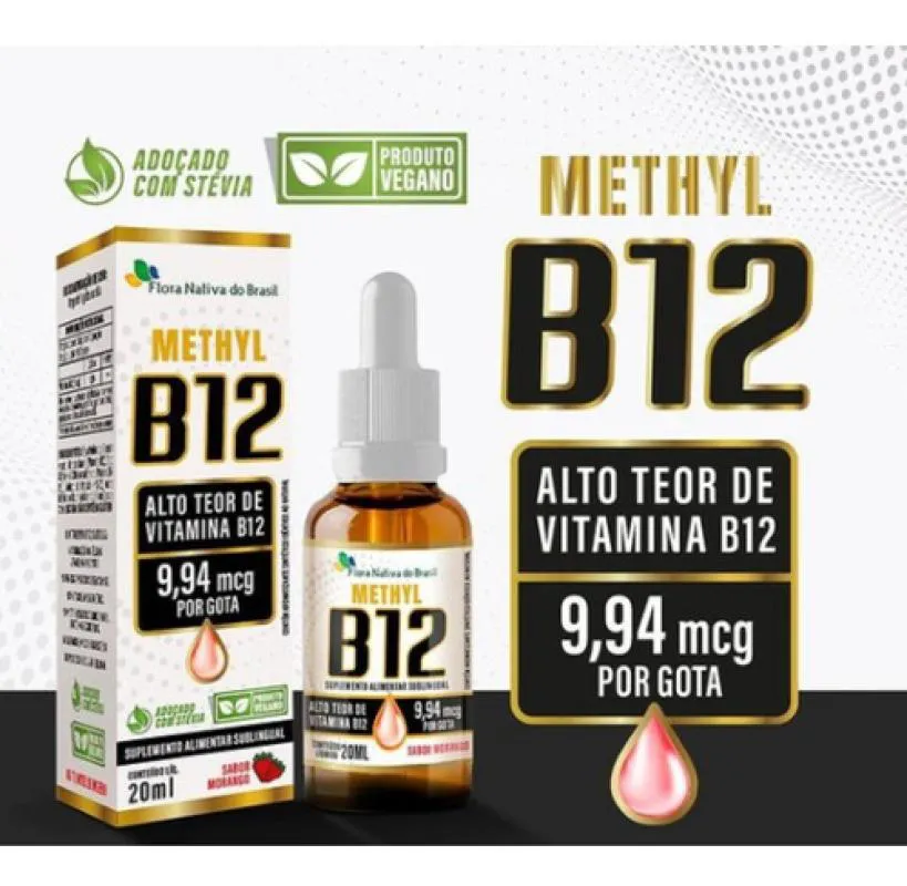 É um suplemento alimentar líquido de vitamina B12 em gotas, com sabor de morango, acondicionado em frasco de 20ml. O produto é formulado com metilcobalamina e contém ingredientes como água purificada, glicerina vegetal e aroma natural de morango.