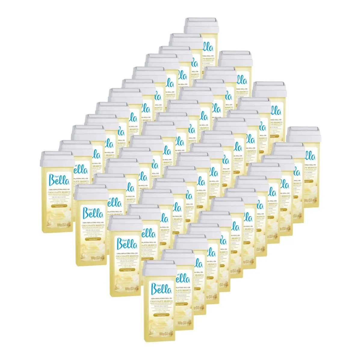 É um kit composto por 48 ceras depilatórias roll-on de 100g, da marca Depil Bella, com extrato de chocolate branco e fórmula cremosa. Serve para remover pelos de forma eficaz em áreas corporais, com aplicação precisa e uniforme, aderindo melhor aos pelos e não à pele, sendo ideal para peles delicadas e todos os tipos de pelos.