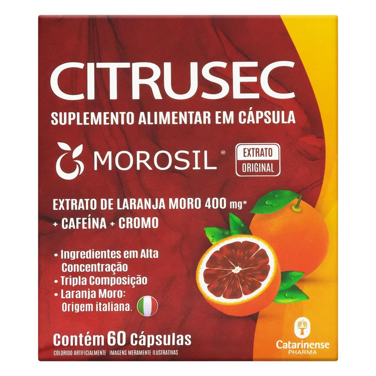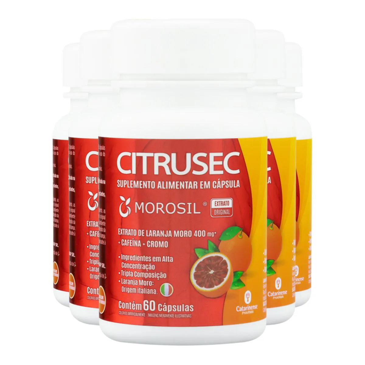 O Kit 5 Citrusec Catarinense 60 Cápsulas é um suplemento alimentar composto por cápsulas contendo extrato de laranja Moro, cafeína e picolinato de cromo. Destina-se a auxiliar em processos metabólicos para indivíduos adultos, com recomendação de ingestão de 2 cápsulas ao dia, visando suporte nutricional complementar.