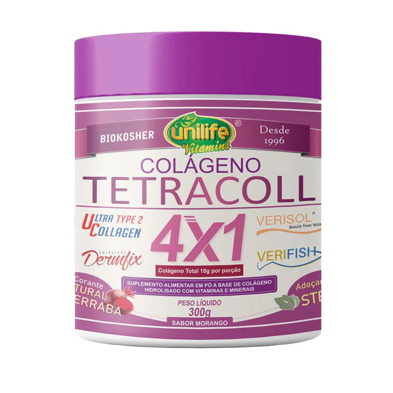 Kit 5 Colágeno 4 em 1 Tetracoll Unilife 300G Morango