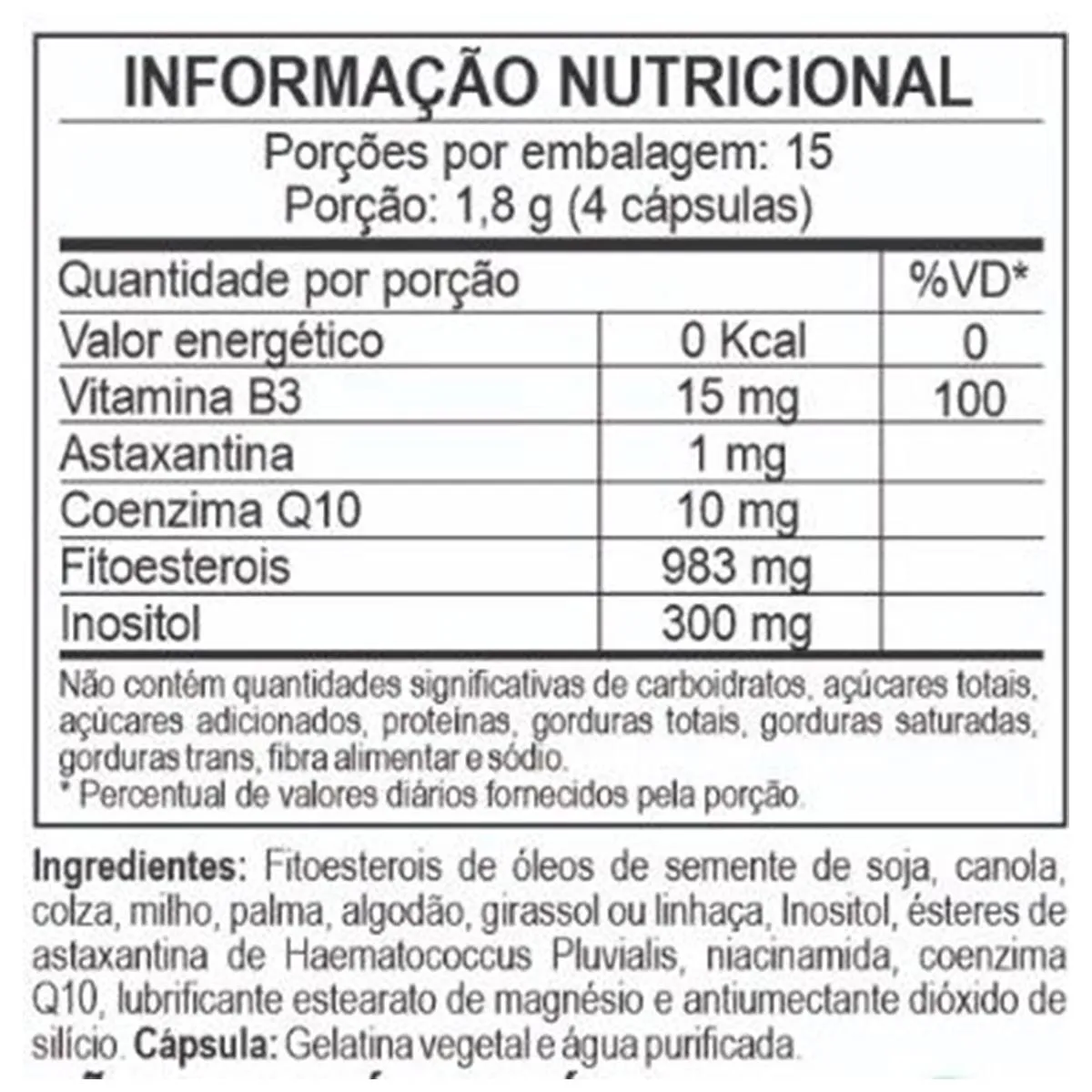 Fitoesterois de óleos de semente de soja, canola, colza, milho, palma, algodão, girassol ou linhaça, inositol, ésteres de astaxantina de Haematococcus Pluvialis, niacinamida, coenzima Q10, lubrificante estearato de magnésio e antiumectante dióxido de silício. Composição da cápsula: Gelatina vegetal e água purificada.