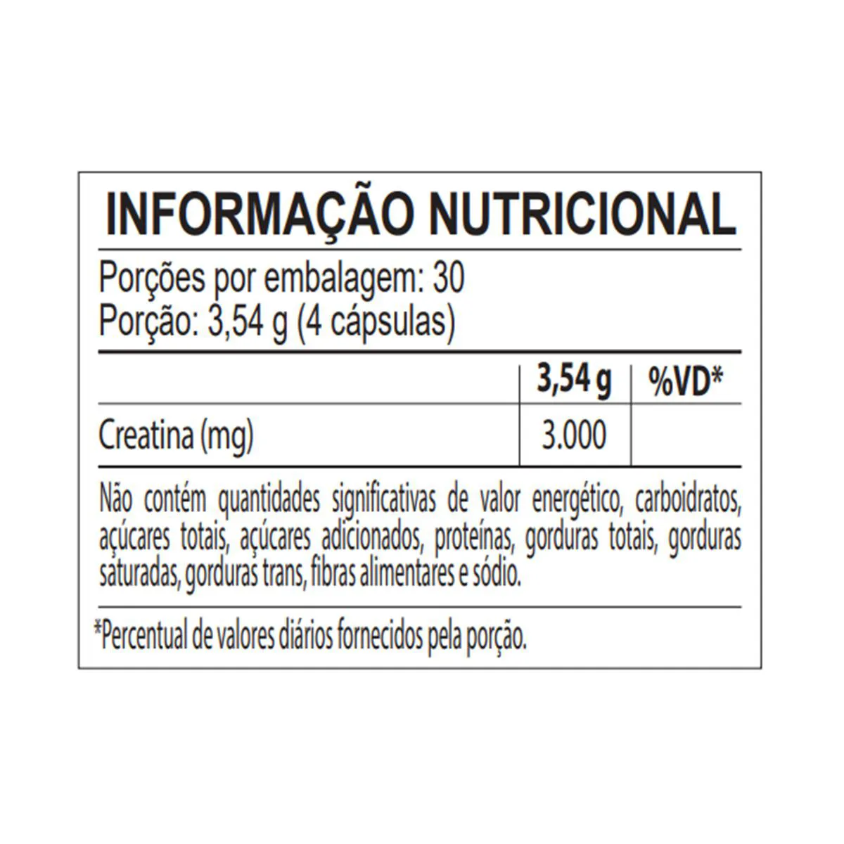 corpo e mente de modo saudável nos torna capazes de alimentar o mundo com atitudes positivas. SUGESTÃO DE CONSUMO: Consumir 4 cápsulas uma vez ao dia ou conforme orientação profissional. CONSERVAÇÃO: Conservar este produto ao abrigo de luz, calor e umidade, antes e após a abertura da embalagem. Após aberto, consumir em até 40 dias e manter o pote com a tampa fechada. INGREDIENTES: Creatina monohidratada, lubrificante estearato de magnésio e gelificante gelatina. NÃO CONTÉM GLÚTEN.Registro: RDC nº 240/2018 ANVISA