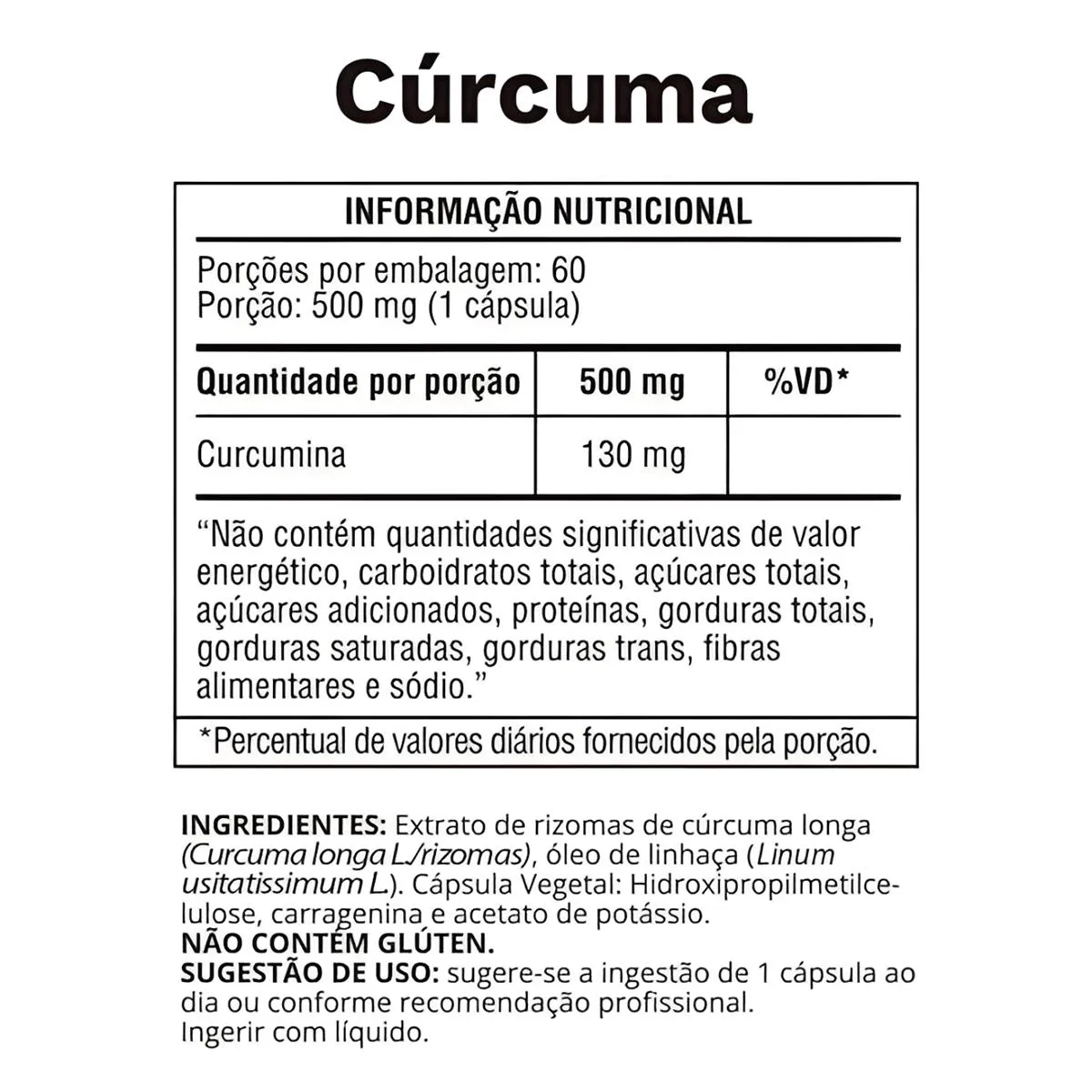 Extrato de rizomas de cúrcuma longa (Curcuma longa L.), óleo de linhaça (Linum usitatissimum L.). Cápsula vegetal: hidroxipropilmetilcelulose, carragenina e acetato de potássio.