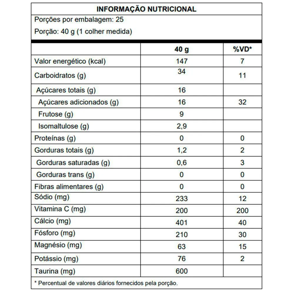 Kit 5 Endurance Extreme Energy Vitafor Laranja 1000gENDURANCE EXTREME ENERGY é um suplemento alimentar em pó composto por uma combinação de três fontes diferentes de carboidratos: maltodextrina, Palatinose e frutose, além de conter taurina, vitamina c e os minerais: sódio, cálcio, potássio e magnésio .Três diferentes fontes de carboidratos: Maltodextrina, Palatinose e Frutose - Excelente alternativa de pré e intra-treino - Contém 200mg de vitamina C por porção - Contém os minerais: cálcio, potássio, magnésio e sódio - Não contém glúten - Sabores refrescantesRecomendações de uso Suplemento alimentar de uso adulto (a partir de 19 anos de idade): ingerir o produto conforme a tabela de recomendação de uso abaixo ou seguir a recomendação de um da saúdeCONTÉM DERIVADOS DE LEITE.NÃO CONTÉM GLÚTEN.Produto dispensado de Registro de acordo com a RDC n° 240/2018 – Anexo I.Informações adicionais - ESTE PRODUTO NÃO DEVE SER CONSUMIDO POR GESTANTES, LACTANTES E CRIANÇAS. - NÃO EXCEDER A RECOMENDAÇÃO DIÁRIA DE CONSUMO INDICADA NA EMBALAGEM. - MANTENHA FORA DO ALCANCE DE CRIANÇAS. - ESTE PRODUTO NÃO É UM MEDICAMENTO.