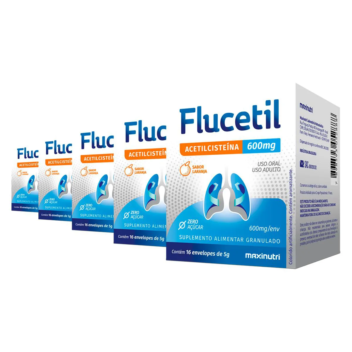Kit 5 Flucetil Acetilcisteína Maxinutri 16 Sachês Laranja