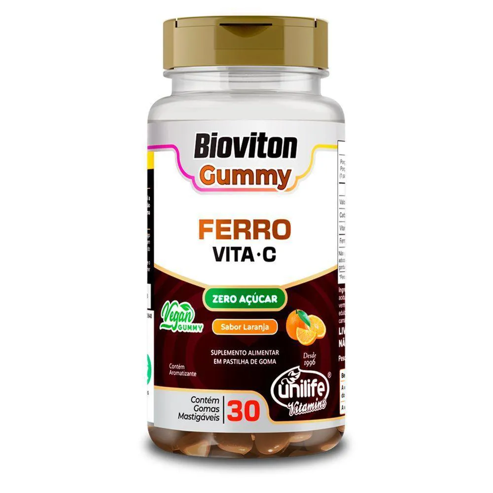 Kit 5 Gummy Ferro + vitamina C Sabor Laranja Unilife 30 GomasModo de ingestão: Ingerir 1 goma ao dia.Este produto é recomendado para grupo populacional a partir de 1 ano. Este produto não é um medicamento. Não exceder a recomendação diária de consumo indicada na embalagem. Mantenha fora do alcance de crianças.Ingredientes: Água, ácido ascórbico, bisglicinato ferroso, acidulante ácido cítrico, aroma natural de laranja, corantes vermelho beterraba e beta-caroteno de Blakeslea trispora, edulcorante isomalte, gelificante pectina, glaceante cera de carnaúba e regulador de acidez di-hidrogenocitrato de sódio.LIVRE DE LACTOSE.