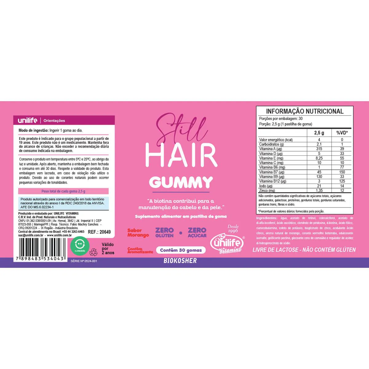 Kit 5 Gummy Hair Still Sabor Morango Unilife 30 gomas GUMMIES - São suplementos em forma de pastilhas de goma, livres de glúten e zero açúcar. A goma utilizada é a pectina gelificante e glaceante cera de carnaúba. Os aromas e corantes são naturais e o edulcorante é isomalte. LIVRE DE LACTOSE NÃO CONTÉM GLÚTEN Armazenamento: Conservar o produto em local seco, arejado e ao abrigo de luz. Após aberto, consumir dentro do prazo de validade. Produto autorizado para comercialização em todo o território nacional através do anexo I da RDC 240/2018 da ANVISA. AFE do MS 6.02234-1.