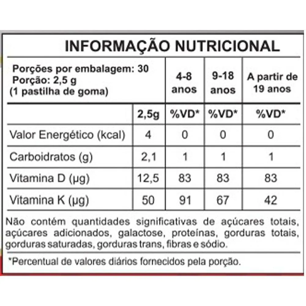 - Mantenha a dose diária de 1 goma para obter os benefícios das vitaminas D3 e K2.