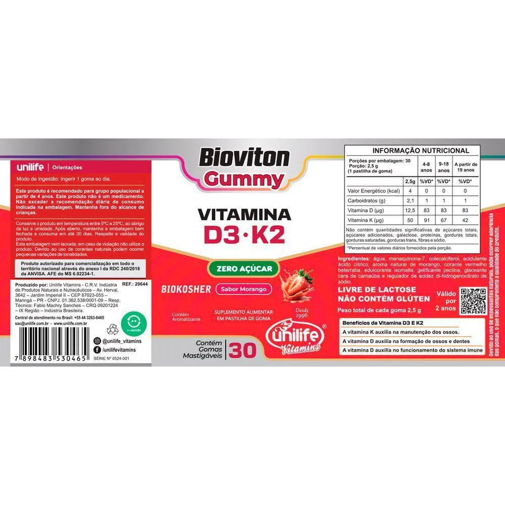 - Suplemento em gomas com vitaminas D3 e K2.