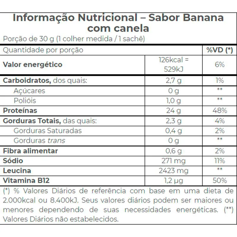 - Selo de Qualidade VLabor. Ingredientes: Sabor Banana com canela: Proteína de ervilha (Pisum sativum L.) isolada, proteína de arroz, leucina, polpa de banana, canela em pó, metilcobalamina (vitamina B12), edulcorantes xilitol e glicosídeos de esteviol (estévia), aromatizante idêntico ao natural e espessante goma xantana. NÃO CONTÉM GLÚTEN.