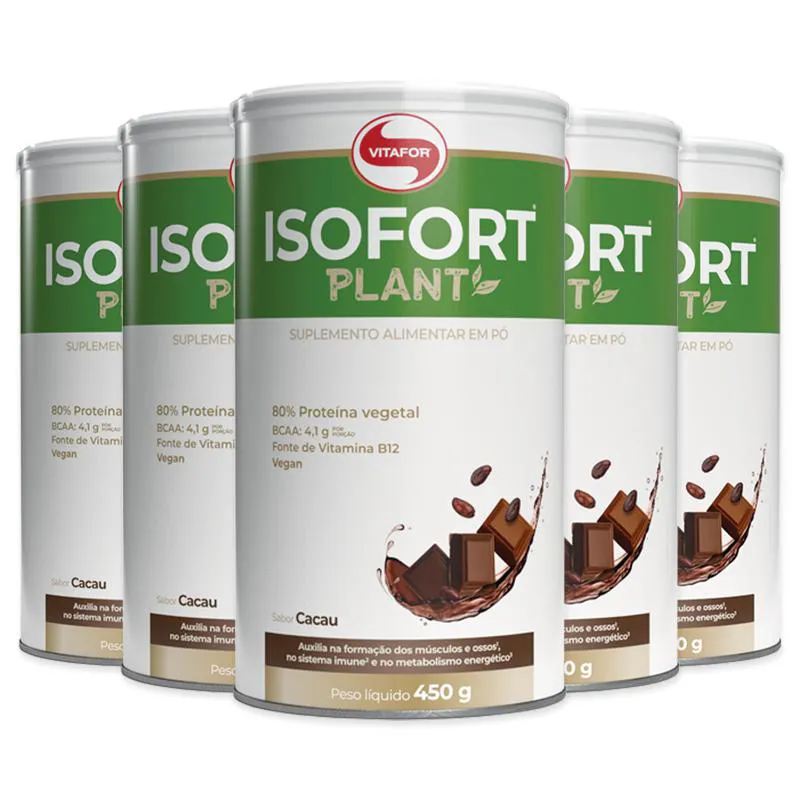 Kit 5 Isofort Plant Vitafor 450g Cacau ISOFORT® PLANT Vitafor é um suplemento alimentar composto por um blend de alta concentração proteica, sendo de proteínas vegetais: proteína isolada de ervilha e proteína de arroz, auxiliando na formação dos músculos e ossos1. Para tornar a fórmula ainda mais completa, adicionamos leucina e vitamina B12, nutriente esse que auxilia no funcionamento do sistema imune, no metabolismo energético, dos carboidratos, proteínas e gorduras2. Para todos que buscam suprir à quantidade de proteínas diárias, sem ingerir proteínas de origem animal, o Isofort Plant é uma excelente opção para suplementação. Benefícios do produto