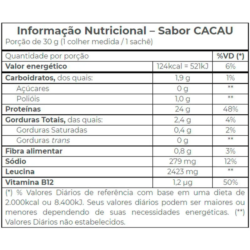 • Selo de Qualidade VLabor Sabor Cacau  Proteína de ervilha (Pisum sativum L.) isolada, proteína de arroz, cacau em pó, leucina, metilcobalamina (vitamina B12), edulcorantes xilitol e glicosídeos de esteviol (estévia) e espessante goma xantana. Não contém Glúten.