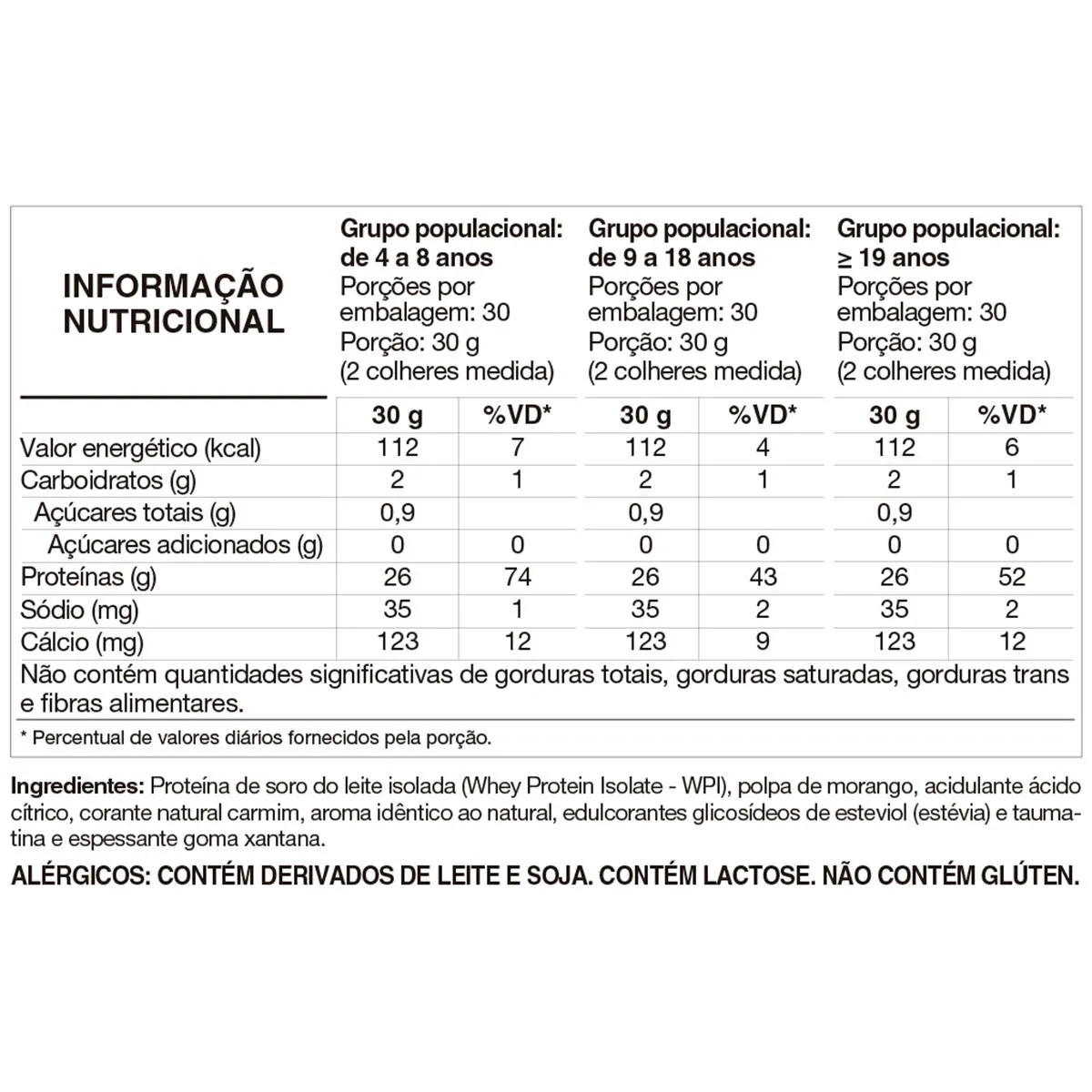 - Selo de Qualidade VLabor. Recomendação de uso: Suplemento alimentar de uso adulto e infantil (a partir de 4 anos de idade): ingerir 30g (2 colheres medida) ao dia ou seguir a recomendação de um profissional da saúde. Modo de preparo: Dissolva 30g (2 colheres medida) em aproximadamente 300 mL de água ou na sua bebida favorita e misture até total homogenização. Beba imediatamente após o preparo. Ingredientes - Frutas Vermelhas: Proteína de soro do leite Isolada (Whey Protein Isolate - WPI), polpa de morango, acidulante ácido cítrico, corante natural carmim, aroma idêntico ao natural, edulcorantes glicosídeos de esteviol (estévia) e taumatina e espessante goma xantana. ALÉRGICOS: CONTÉM DERIVADOS DE LEITE E LECITINA DE SOJA. CONTÉM LACTOSE. NÃO CONTÉM GLÚTEN. Cuidados e conservação: - Manter o produto bem fechado e conservar ao abrigo da luz, calor, odor e umidade.