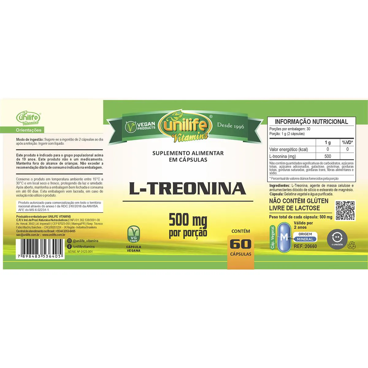 Kit 5 L-Treonina Unilife 500mg 60 Cápsulas Modo de uso: