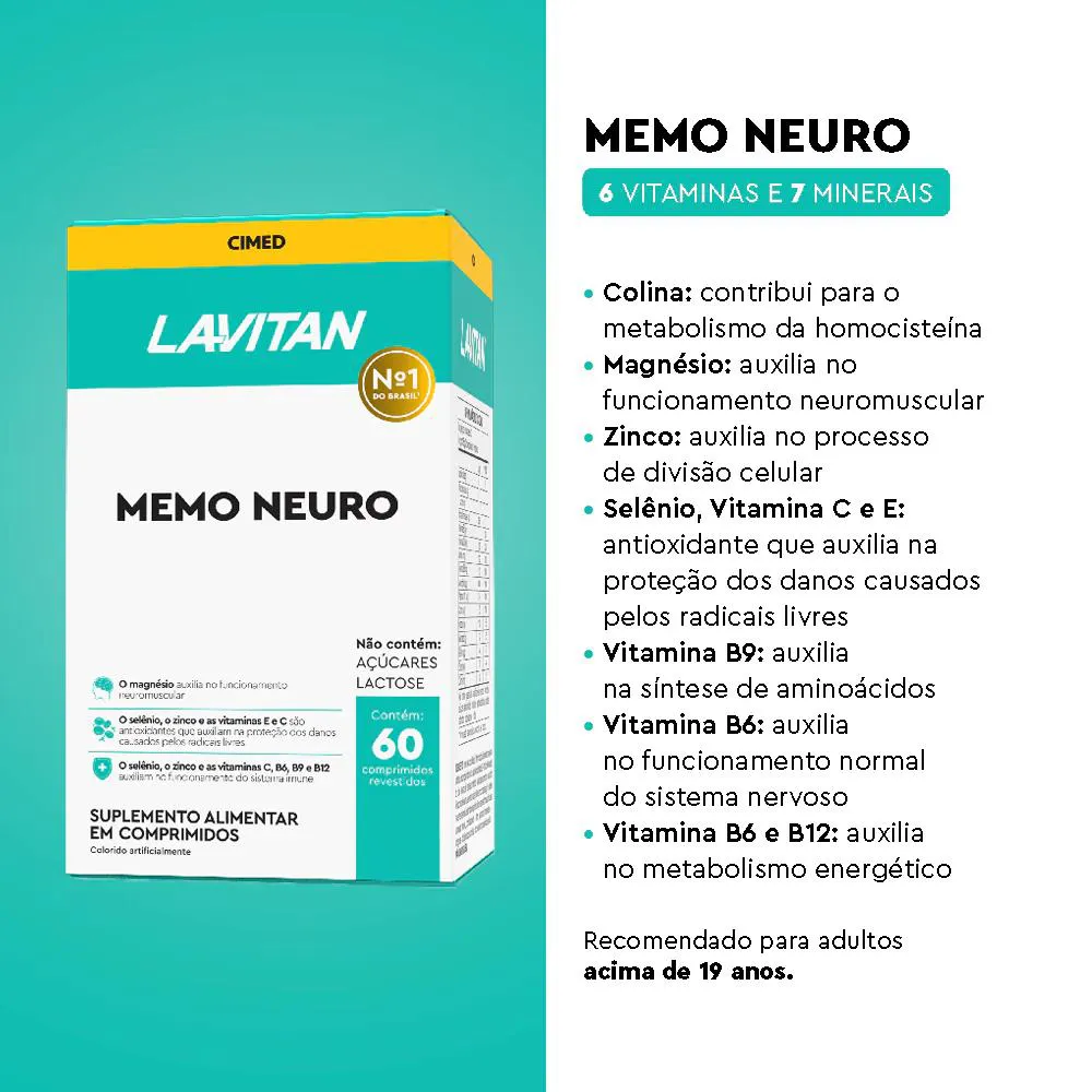 Kit com 5 Suplemento Alimentar MEMO NEURO com 60 Comprimidos – Cimed Fórmula composta por vitaminas do complexo B, vitamina c e os minerais zinco, magnésio e selênio. A seguir estão os principais componentes e seus benefícios: -As vitaminas C e E são antioxidantes que auxiliam na proteção dos danos causados pelos radicais livres; -A vitamina C auxilia no funcionamento do sistema imune; -A tiamina auxilia no metabolismo energético; MODO DE USO: Ingerir 2 comprimidos ao dia. Ingerir com líquido. Uso oral ≥ 19 anos COMPOSIÇÃO: Fosfato de Cálcio dibásico, bitartarato de colina, óxido de magnésio, sulfato de zinco heptaidratado, ácido ascórbico, acetato de DL-alfa-tocoferol, selenato de sódio, cloridrato de tiamina, cloridrato de piridoxina, picolinato de cromo, ácido fólico, cianocobalamina. Agente de massa: celulose microcristalina (gel de celulose).Revestimento: (estabilizante hidroxipropilmetilcelulose, agente de massa etilcelulose, umectante triacetina, corantes dióxido de titânio, amaranto, vermelho allura AC e indigotina).Estabilizante: croscarmelose sódica. Antiumectante: Dióxido de silício. NÃO CONTÉM GLÚTEN. SOBRE A LOJA: Somos a rede de farmácias mais antiga de São José dos Pinhais, atuando no ramo farmacêutico desde 1990 com comprometimento à qualidade e satisfação do cliente. É um prazer compartilhar os nossos valores e as nossas conquistas com quem confia no nosso trabalho! Imagens dos Produtos são Meramente Ilustrativas. Todas as Informações Divulgadas são de Responsabilidade Exclusiva do Fabricante/fornecedor.