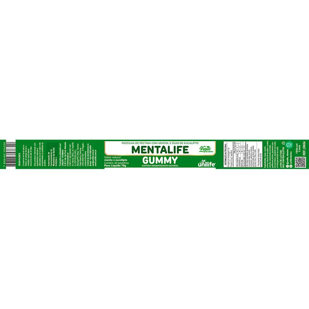 O Mentalife Gummy é um suplemento em formato de pastilhas de goma, elaborado com ingredientes naturais e sabor refrescante de menta com eucalipto. Trata-se de um produto vegano, sem glúten e sem açúcar, apresentado em uma embalagem prática com 30 pastilhas. Sua composição inclui água, mentol, aroma natural de eucalipto e outros ingredientes que proporcionam uma textura suave e refrescante.