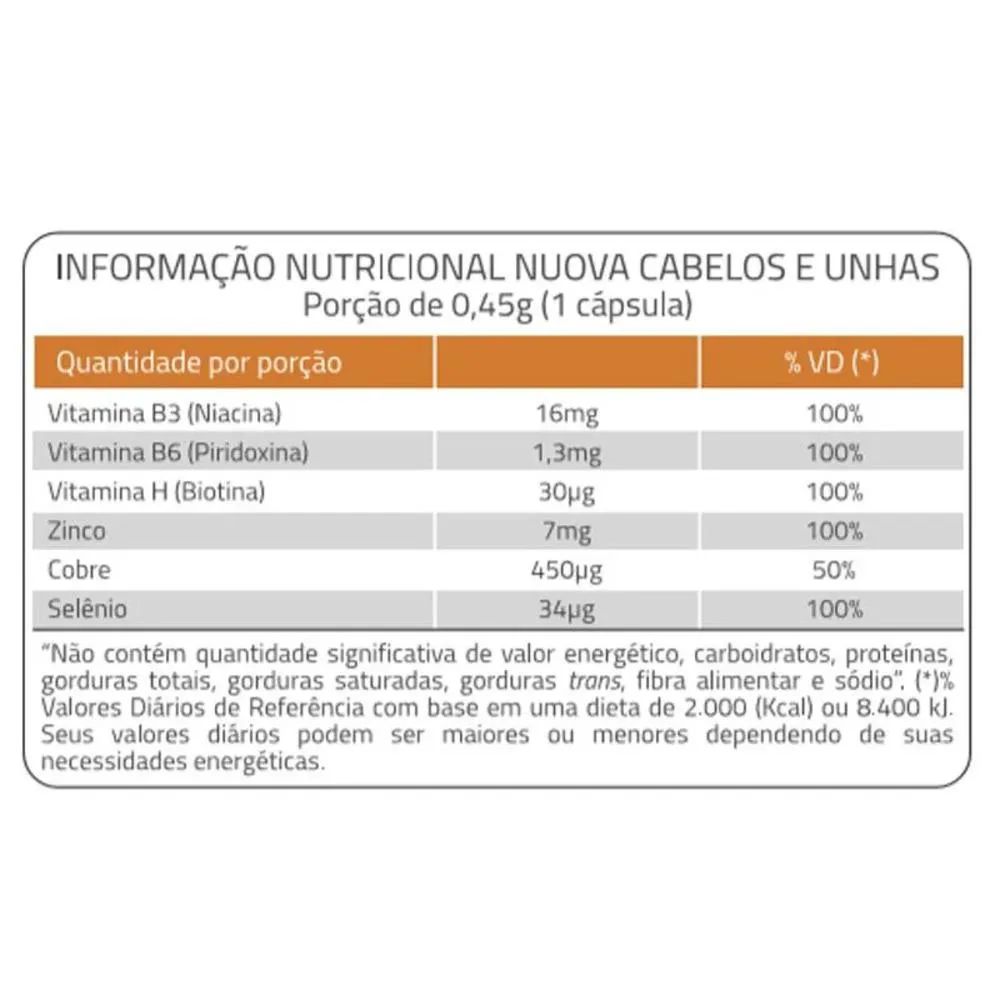 Nuova é um nutri cosmético que contribui para a manutenção do cabelo, da pele e das unhas, além de auxiliar no realce da pigmentação do fios. 1 cápsula por dia. Ingredientes: Nicotinamida, Óxido de Zinco, Cloridrato de Piridoxina, Sulfato de Cobre Anidro, Selenito de Sódio e Biotina. Veículo: Celulose Microcristalina (INS 460i) e colágeno Hidrolisado. Lubrificante: Estearato de Magnésio Vegetal (INS 470iii). Antiumectante: Dióxido de Silício (INS 551). Gelificante: Gelatina (INS 428). Corantes: Dióxido de Titânio (INS 171), Quinoleína (INS 104) e Amarelo Crepúsculo (INS 110). Acidulante: Ácido Acético (INS 260). NÃO CONTÉM GLÚTEN.