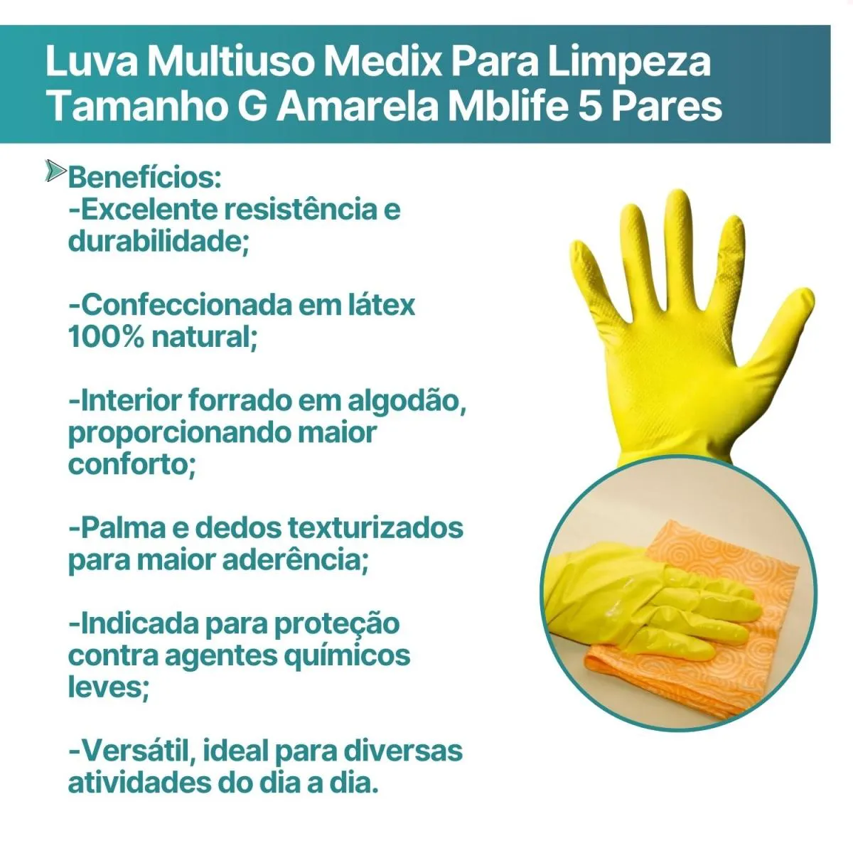 A Luva de Látex Multiuso Amarela Medix é confeccionada em 100% borracha natural (látex) e foi desenvolvida para oferecer alta resistência, conforto e excelente desempenho em atividades que exigem proteção contra umidade, sujeira e agentes químicos leves, sendo ideal para serviços de limpeza e manutenção. Seu design anatômico proporciona ajuste fácil às mãos, permitindo movimentos mais firmes e seguros durante toda a jornada de trabalho. Conta ainda com interior forrado em algodão, que reduz a umidade interna, melhora o conforto térmico e minimiza o desconforto causado pelo suor no uso prolongado. A palma e os dedos texturizados garantem ótima aderência no manuseio de objetos secos, molhados ou escorregadios, tornando o trabalho mais seguro e eficiente.