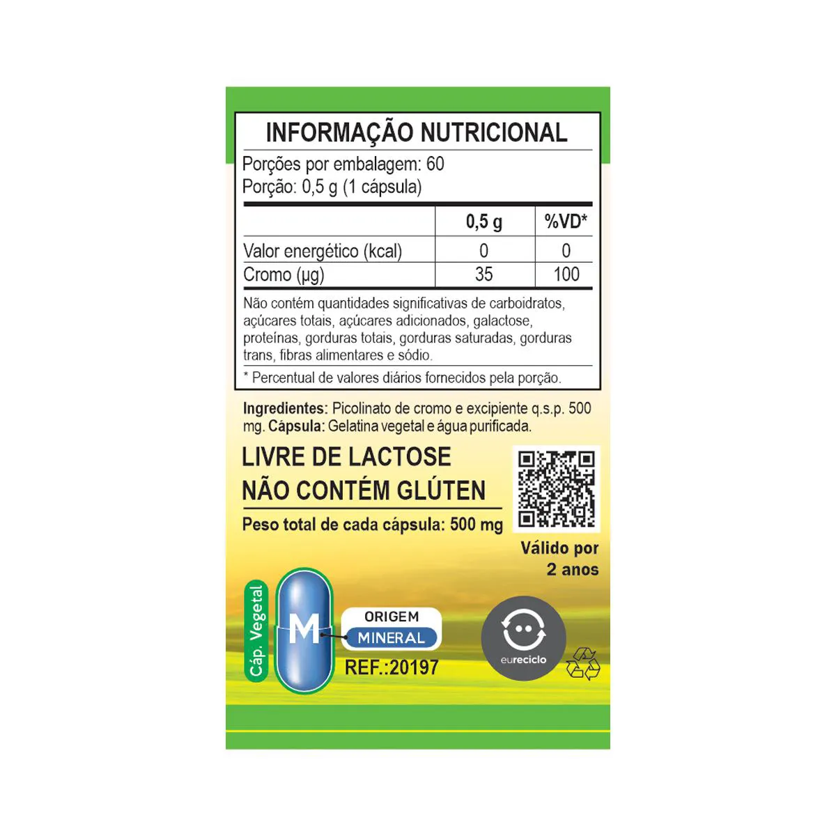 Sugestão de uso: Ingerir 1 cápsula ao dia, preferencialmente após a principal refeição, ou conforme orientação de profissional de saúde. Ingredientes: Picolinato de cromo, amido, antiumectantes estearato de magnésio e dióxido de silício. Cápsula: gelatina vegetal (ou gelatina, conforme versão do produto). Informações: Não contém glúten. Livre de lactose. Produto vegano. Produto indicado para adultos (> 19 anos). Este produto não é um medicamento. Não exceder a recomendação diária de consumo indicada na embalagem. Manter fora do alcance de crianças.Não deve ser consumido por gestantes, lactantes e crianças sem orientação profissional.