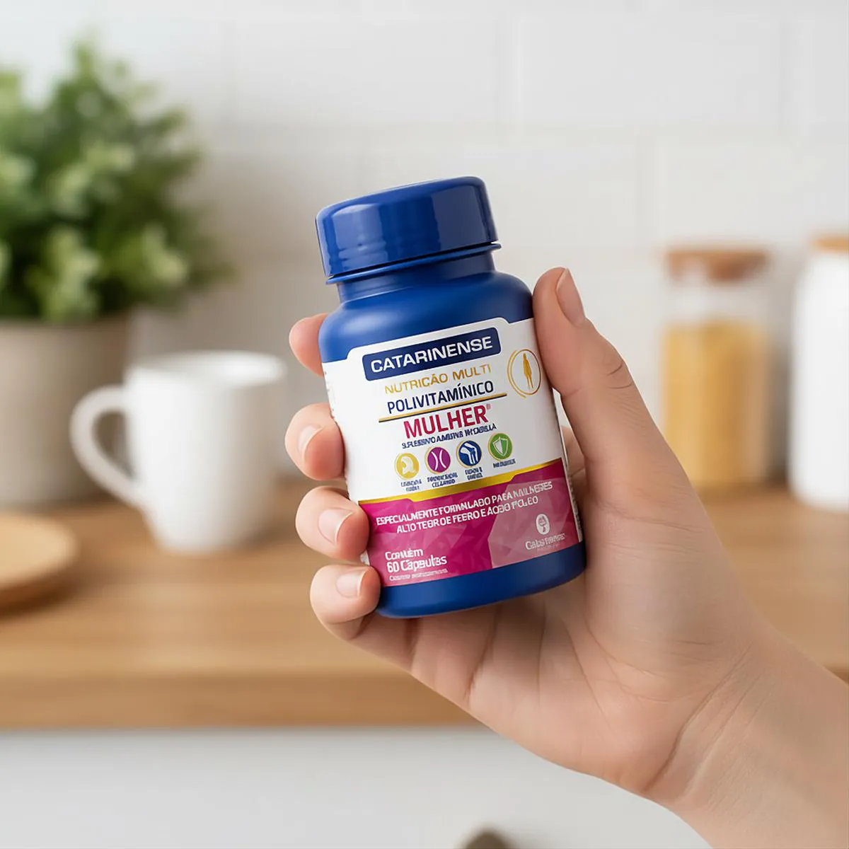 Kit 5 Polivitamínico Mulher Catarinense 60 cápsulas Foi desenvolvido com base nas necessidades nutricionais específicas das Mulheres. Sua composição de nutrientes foi cuidadosamente escolhida de modo a complementar a ingestão de vitaminas e minerais, essenciais para o bem-estar da mulher.