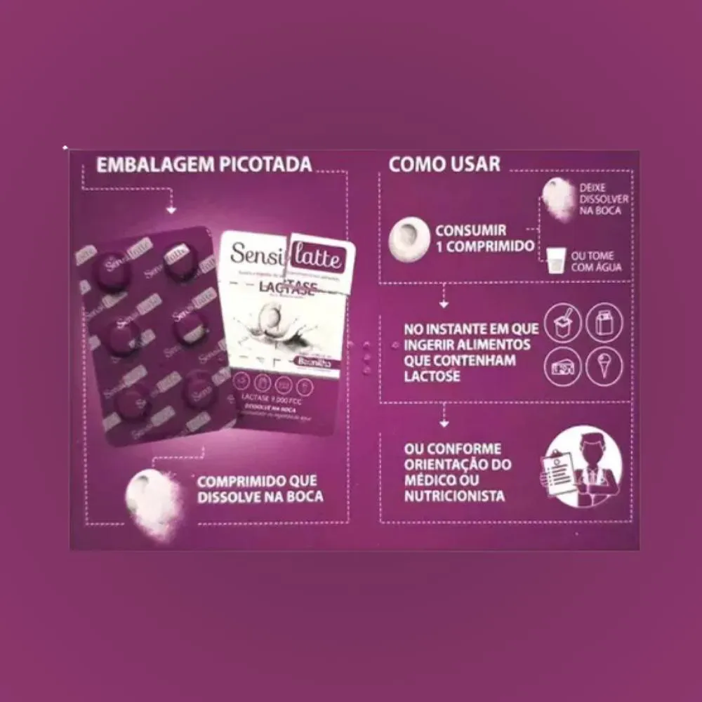 Kit com 5 Sensilatte Lactase 9.000FCC com 30 comprimidos Sabor Baunilha– Prati Donaduzzi O Sensilatte é um comprimido para intolerantes à lactose que permite consumir leite e derivados sem preocupações. A enzima contida em Sensilatte faz a quebra da lactose em moléculas menores (glicose e galactose), facilitando a absorção. Quais os benefícios? Possibilita uma rotina mais leve e descomplicada aos intolerantes à lactose pois permite consumir leite e derivados sem sentir sintomas indesejados. Porque é mais prático? Sensilatte possui tecnologia orodispersível (dissolve na boca) e não necessita de água para ingestão. Além disso, vem em cartelas com comprimidos destacáveis. Há Contraindicações? Não deve ser consumido por indivíduos alérgicos ao fungo Aspergillus Oryzae (utilizado para fabricar a lactase). Consumir sob orientação do médico ou nutricionista. MODO DE USO: Consumir 1 comprimido no instante em que ingerir alimentos que contenham lactose ou conforme orientação do médico ou nutricionista. Deixe dissolver na boa ou tome com água. COMPOSIÇÃO: manitol (veículo), lactase de Aspergillus oryzae, estabilizantes, polivinilpirrolidona e celulose microcristalina, edulcorante sucralose e aroma. NÃO CONTÉM GLÚTEN. SOBRE A LOJA: Somos a rede de farmácias mais antiga de São José dos Pinhais, atuando no ramo farmacêutico desde 1990 com comprometimento à qualidade e satisfação do cliente. É um prazer compartilhar os nossos valores e as nossas conquistas com quem confia no nosso trabalho! Imagens dos Produtos são Meramente Ilustrativas. Todas as Informações Divulgadas são de Responsabilidade Exclusiva do Fabricante/fornecedor.