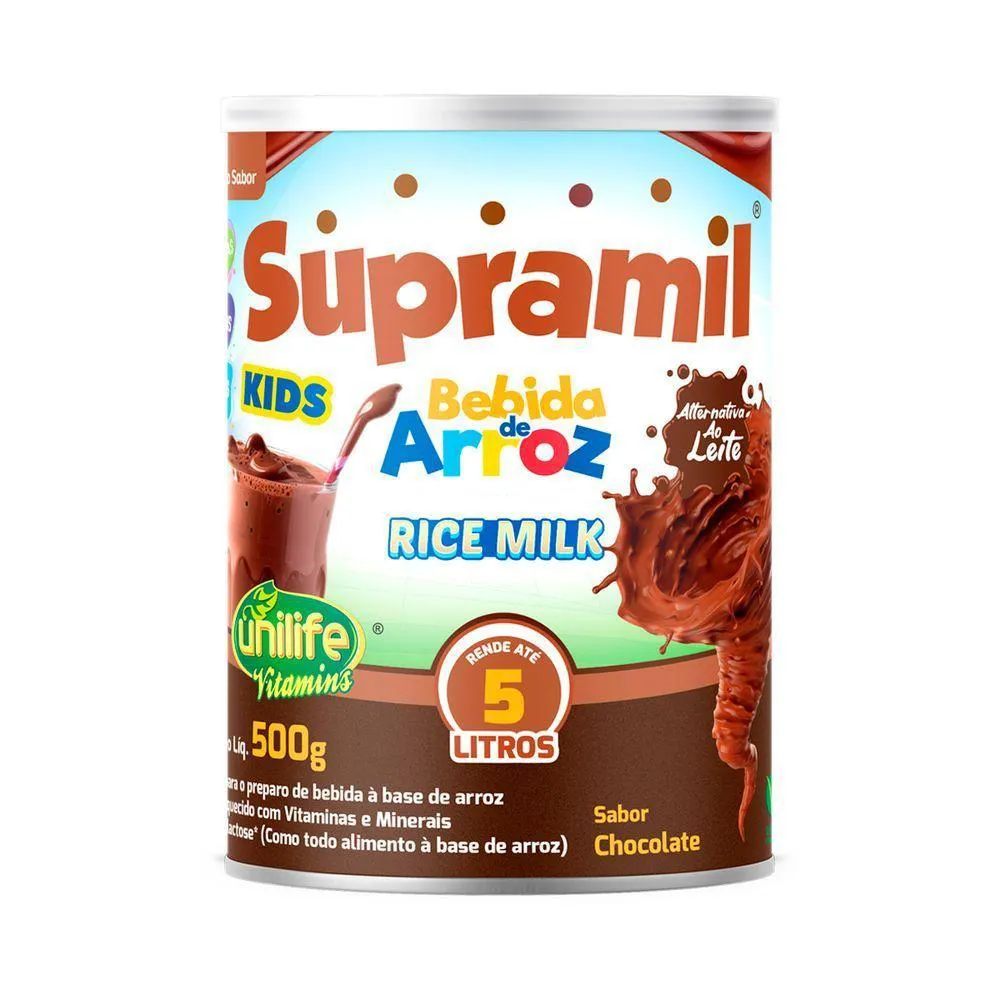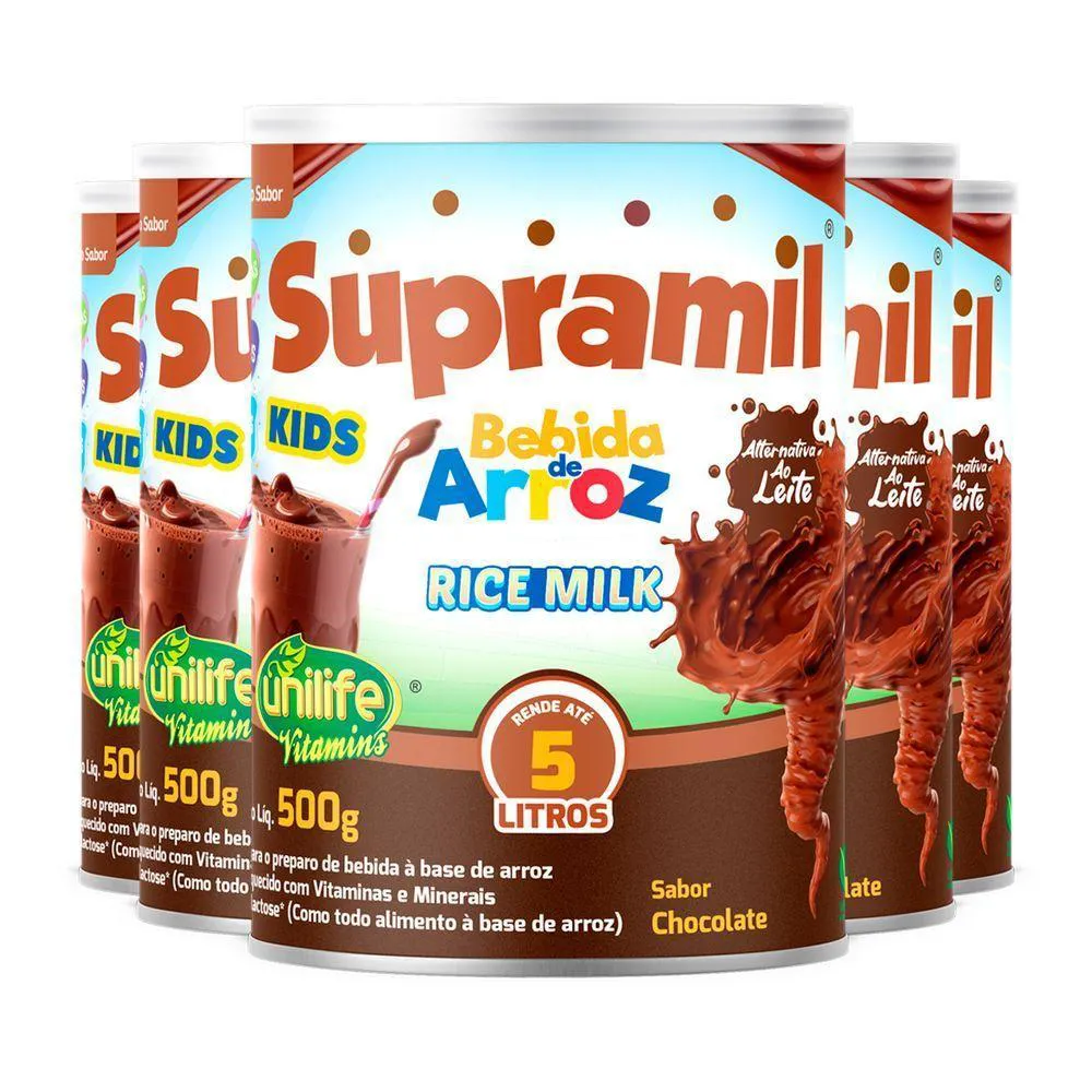 Kit 5 Supramil Bebida de Arroz Kids Chocolate Unilife 500gA Bebida de Arroz é uma ótima alternativa ao leite comum, especialmente para pessoas com intolerância alimentar. Rica em vitaminas, fibras e minerais.Indicado para substituição pelos leites vegetais (enriquecidos com cálcio e vitaminas). O leite de arroz é um dos melhores substitutos, principalmente a sua versão em pó, já que, além de enriquecida, também pode substituir o leite em receitas diversas, doces ou salgadas.BenefíciosÉ enriquecida com vitaminas (vitamina c, vitamina D2 e vitamina k) fibras e minerais como o cálcio.Modo de usarAdicione 2 colheres de sopa em 200ml de água. Mexer bem.AlergênicosNÃO CONTÉM GLÚTEN.Código AnvisaProduto autorizado para comercialização em todo o território nacional através da RDC 719/2022 da ANVISA. AFE do MS 6.02234-1