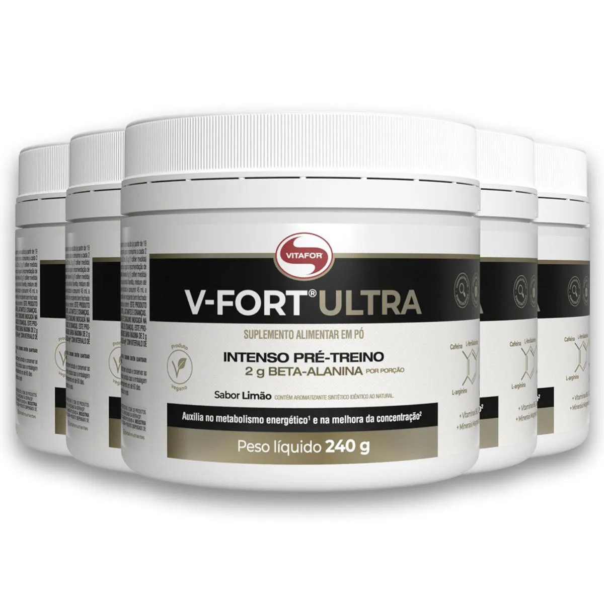 O Kit 5 V Fort Ultra Vitafor é um suplemento alimentar composto por aminoácidos, vitaminas e minerais, desenvolvido para auxiliar no desempenho físico e nutricional. Apresenta-se como um produto de fácil solubilidade, sem corantes artificiais, zero açúcar e glúten, com ingredientes como beta-alanina, L-arginina, cafeína e outras substâncias nutricionais.