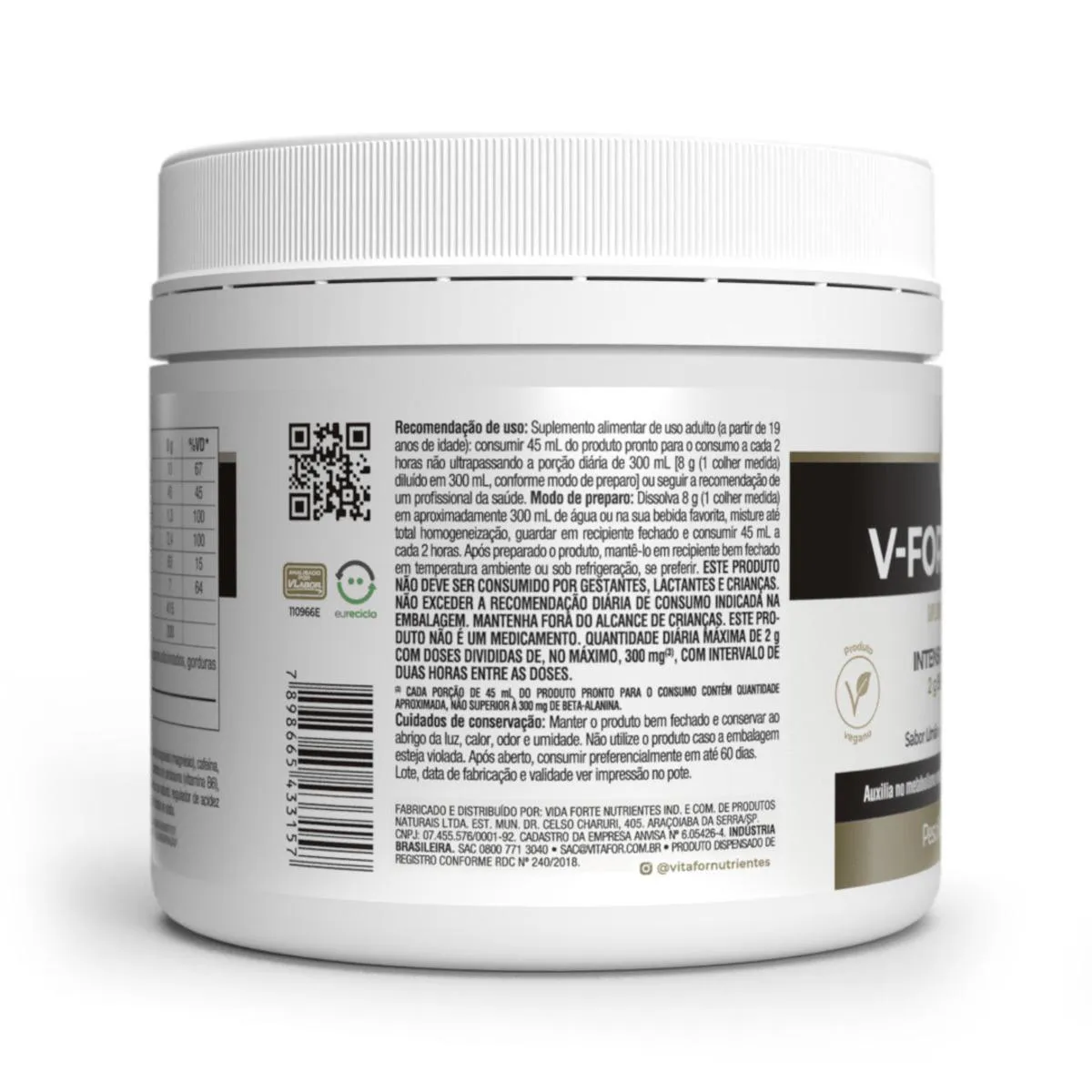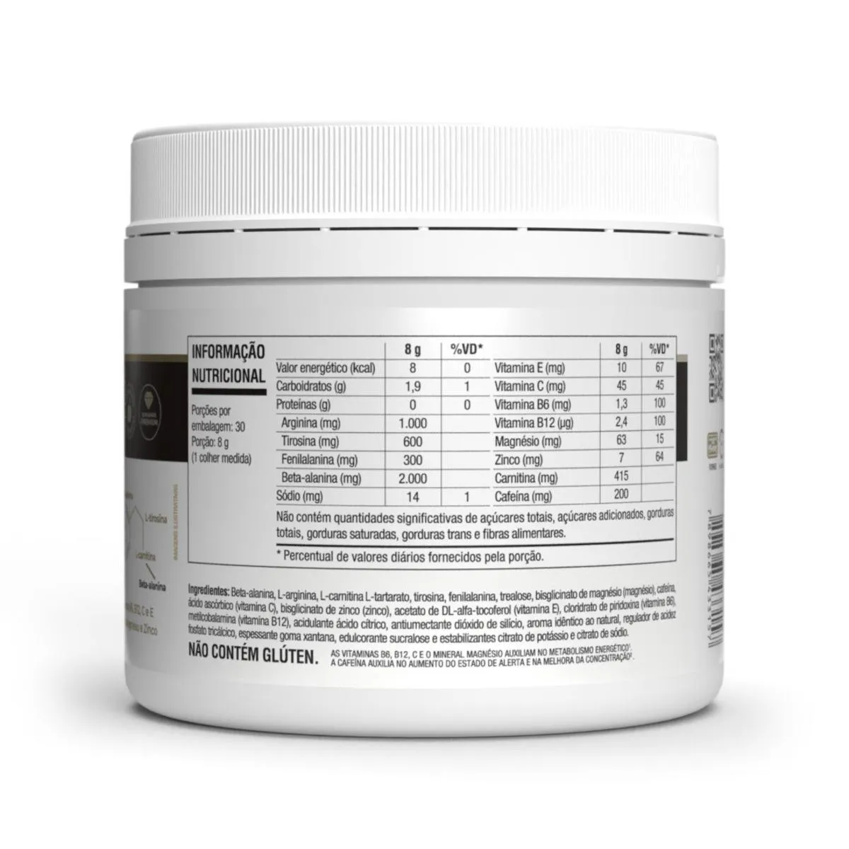 - Contém beta-alanina, L-arginina e cafeína.