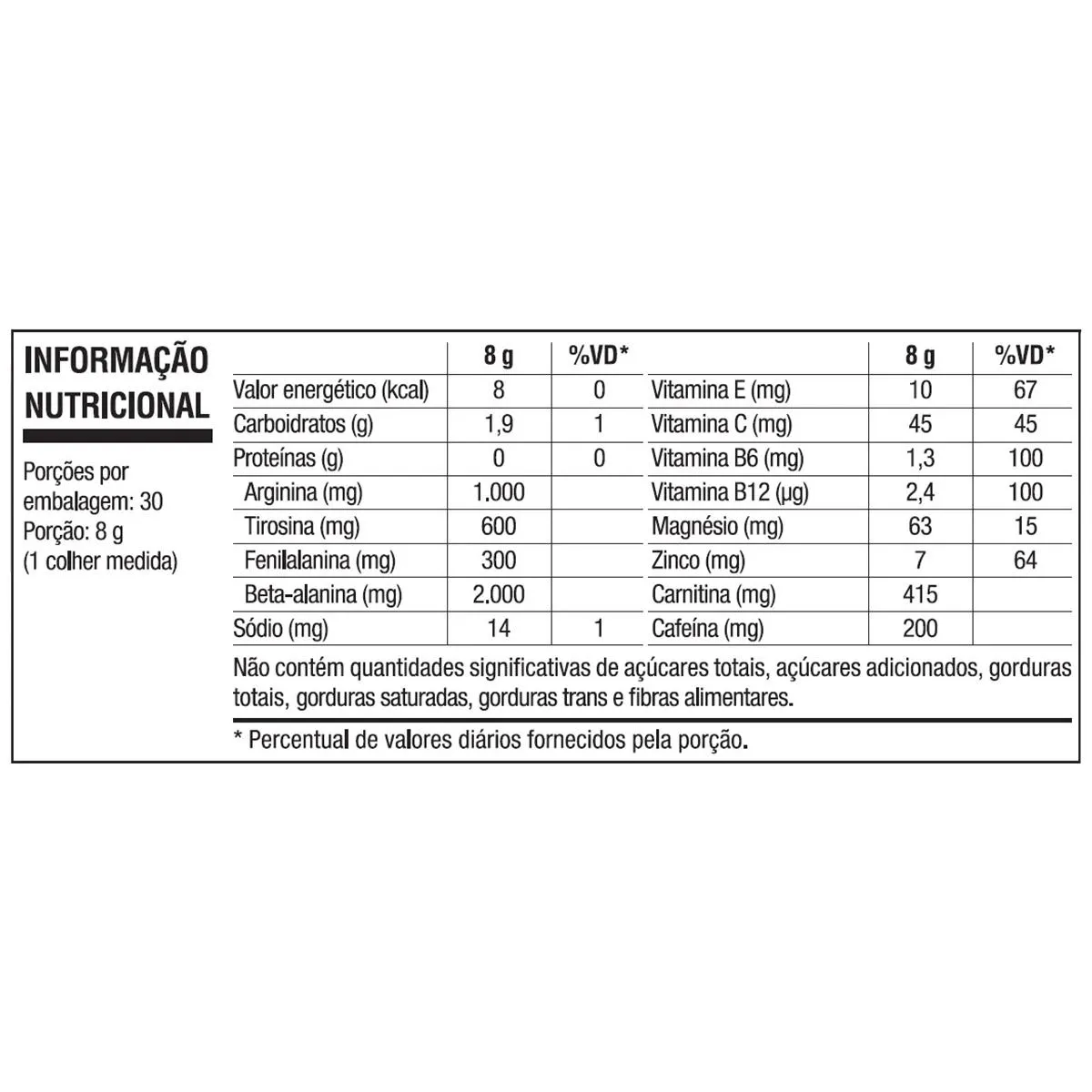 - Adicionado de cafeína (200 mg por dose) para energia e concentração.