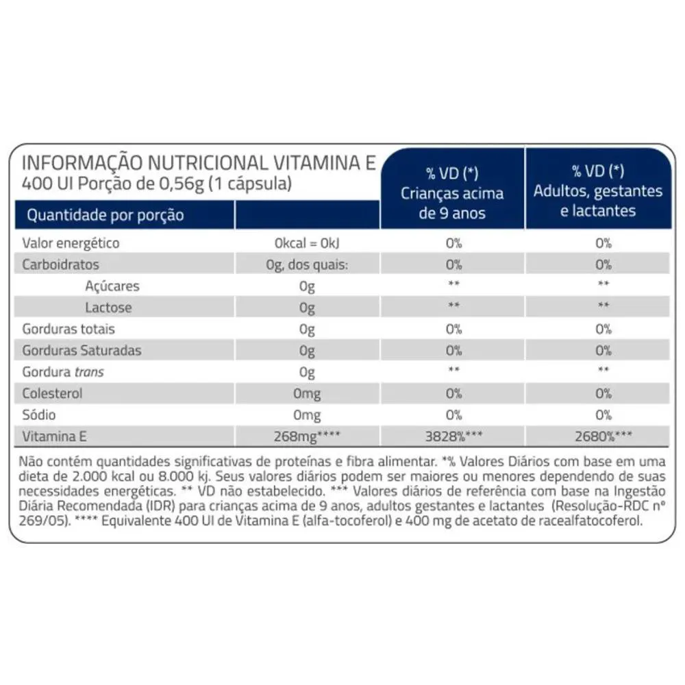 A vitamina E é um antioxidante que auxilia na proteção dos danos causados pelos radicais livres. Ingredientes: