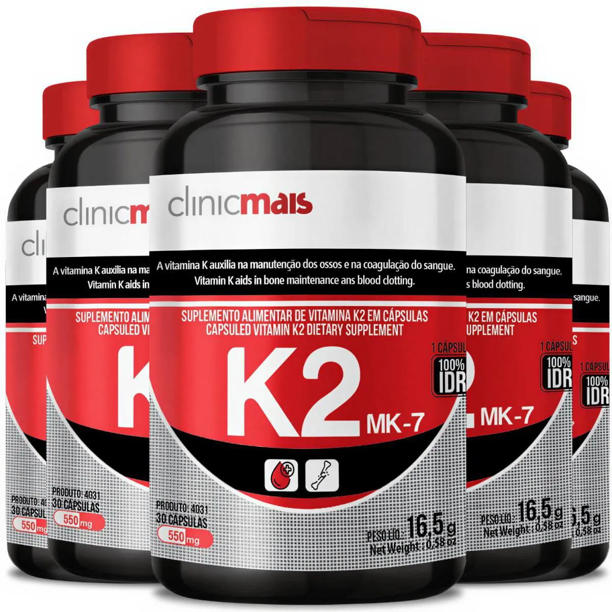 COMBO 5 vitamina K2 MENAQUINONA 7 MK-7 65MCG POR CÁPSULA COM 30 CÁPSULAS CADA - TOTAL: 150 CÁPSULAS - CLINICMAIS _x000D_ _x000D_ – descrição – INDÚSTRIA DO corpo _x000D_ Vitamina K2 conhecida como menaquinona -7, é um suplemento alimentar essencial para a formação e reparo dos ossos, realiza a síntese da osteocalcina que é uma proteína no tecido ósseo utilizada para cristalização do cálcio, inibe a calcificação dos vasos sanguíneos, removendo os depósitos onde não são necessários. A vitamina K2 auxilia na desinflamação das articulações. _x000D_ _x000D_ – benefícios – INDÚSTRIA DO CORPO _x000D_ - 1 Cápsula fornece 100% da IDR (ingestão diária recomendada); _x000D_ - Além da distribuição do cálcio para o lugar certo (ossos), a vitamina k2 proporciona os seguintes benefícios para o organismo: _x000D_ - Artérias mais flexíveis, diminuindo a pressão arterial; _x000D_ - Dentes mais fortes; _x000D_ - Ossos mais fortes; _x000D_ - Auxilia a limpar as válvulas cardíacas, tirando o cálcio em excesso; _x000D_ - Auxilia a limpar o músculo cardíaco, para o coração bater com mais tranquilidade; _x000D_ - Auxilia a evitar arritmia cardíaca; _x000D_ - Desinflama as articulações; _x000D_ - Tira o excesso de cálcio dos rins, evitando as pedras de rins; _x000D_ - Tira o excesso de cálcio da pele, evitando o envelhecimento; _x000D_ - Tira o excesso de cálcio do cérebro, aliviando o órgão sobrecarregado. _x000D_ _x000D_ – sugestão de uso – INDÚSTRIA DO CORPO _x000D_ Ingerir 1 cápsula ao dia. _x000D_ _x000D_ – tabela nutricional – INDÚSTRIA DO CORPO _x000D_ EM ANEXO NAS IMAGENS _x000D_ _x000D_ – composição – INDÚSTRIA DO CORPO _x000D_ EM ANEXO NAS IMAGENS _x000D_ _x000D_ – recomendações – INDÚSTRIA DO CORPO _x000D_ EM ANEXO NAS IMAGENS _x000D_ _x000D_ – dados técnicos – INDÚSTRIA DO CORPO _x000D_ Marca – Clinicmais. _x000D_ Conteúdo líquido por frasco - 30 cápsulas. _x000D_ Conteúdo líquido total - 150 cápsulas.