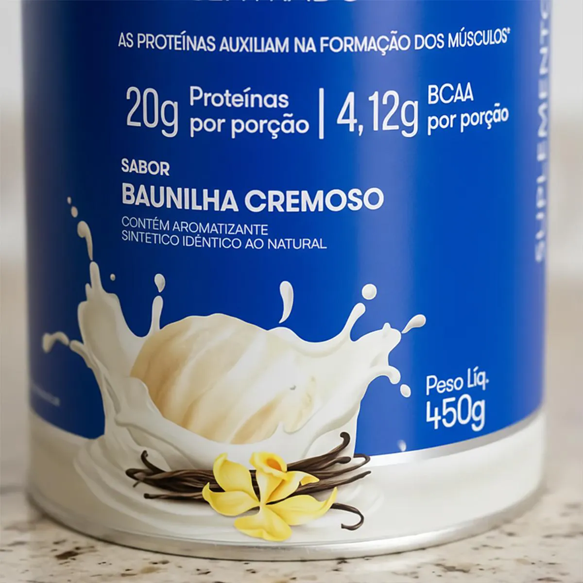 Proteína de soro do leite concentrada, espessantes goma guar e goma xantana, edulcorantes sucralose e acessulfame de potássio, aromatizante sintético idêntico ao natural de baunilha.
