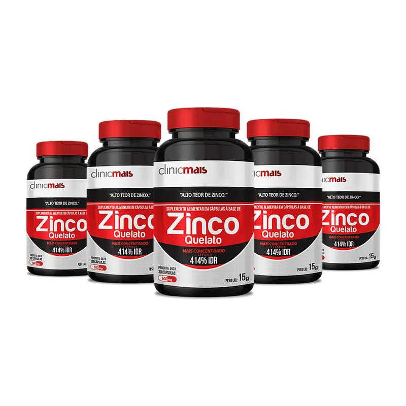 Kit 5 Zinco Quelato 500mg Clinic Mais 30 cápsulas Sobre o produto: O zinco participa na síntese de proteínas otimizando sua produção e absorção pelo organismo. Tem a função de manter a pele, cabelo e unhas saudáveis. Ajuda no combate a acne, na cicatrização de feridas e aumenta as defesas imunitárias. Além disso, o zinco é um antioxidante que auxilia na proteção dos danos causados pelos radicais livres. O zinco também auxilia na visão, no metabolismo da vitamina A, no metabolismo de proteínas, carboidratos e gorduras, na síntese de proteínas, no processo de divisão celular, na manutenção dos ossos, e no funcionamento do sistema imune. Como consumir: Ingerir 1 cápsula ao dia. OBS: Indicado para pessoas maiores de 19 anos. Composição: Zinco (bisglicinato de zinco). Antiumectantes: amido e dióxido de silício. Composição da cápsula: gelatina, opacificante inorgânico dióxido de titânio. NÃO CONTÉM GLÚTEN.
