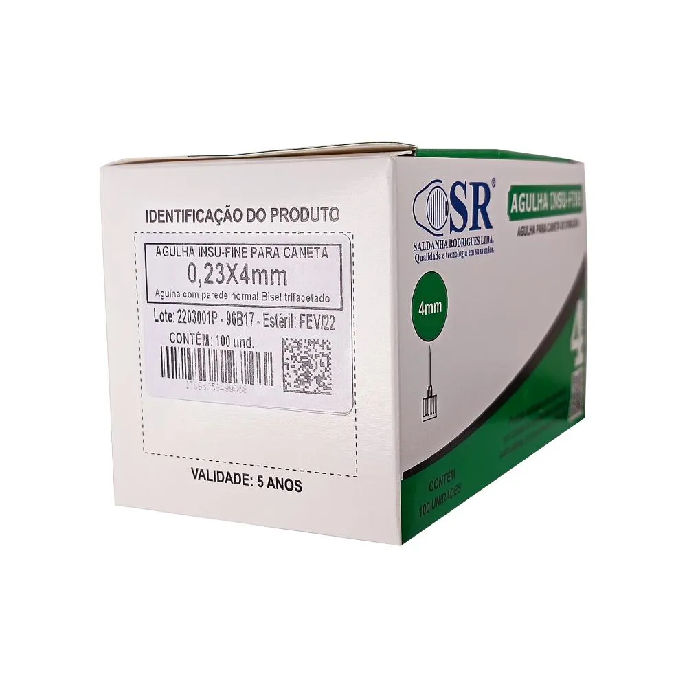 Agulha Insulina Fine - Agulhas para Caneta de Insulina 4mm x 32G Caixa/Kit com 500 unidades Indicação: As agulhas para caneta de insulina são indicadas para administração multidose de insulina no corpo. Possuem bisel trifacetado siliconizado, permitindo injeções mais suaves e confortáveis. Descrição: