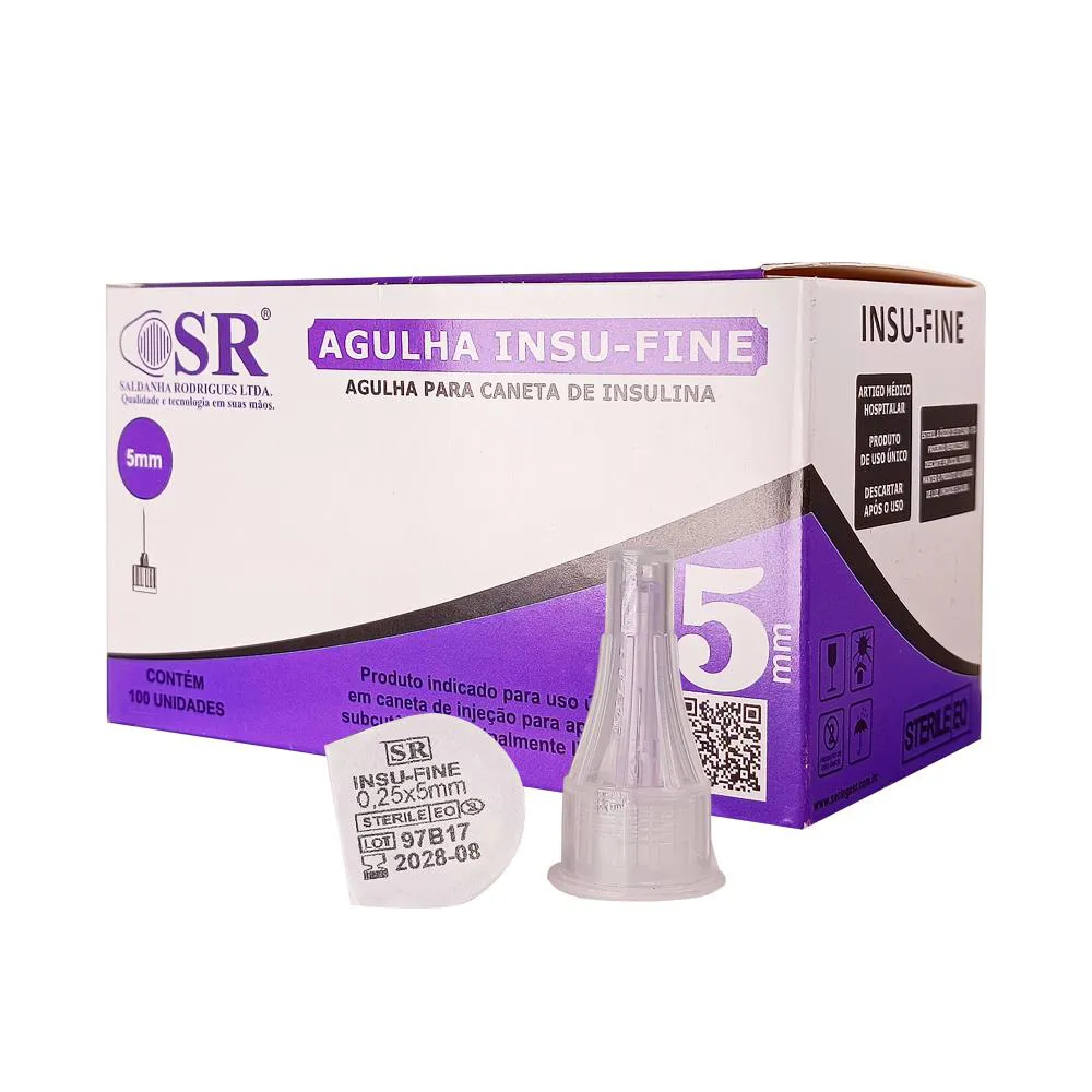 Agulha Insu Fine - Agulhas para Caneta de Insulina 5mm x 31G Caixa/Kit com 500 unidades Indicação: As agulhas para caneta de insulina/saxenda são indicadas para administração multi-dose de insulina no corpo. Possuem bisel trifacetado siliconizado, permitindo injeções mais suaves e confortáveis. Descrição:
